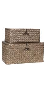 Hipiwe - Juego de 2 cestas de mimbre tejidas planas con tapa, cestas de algas marinas naturales, cajas multiusos para el hogar, organizador de estantes (café)