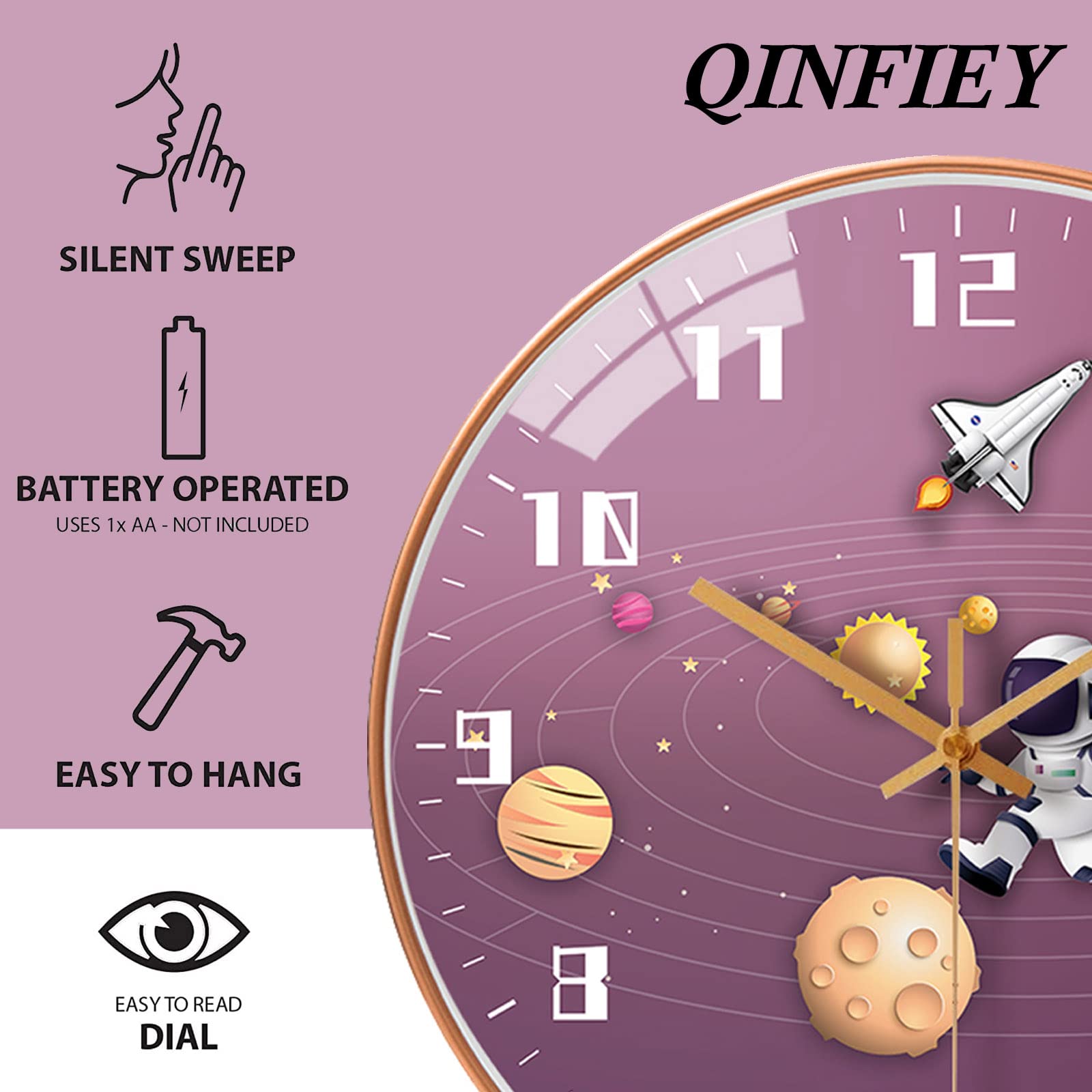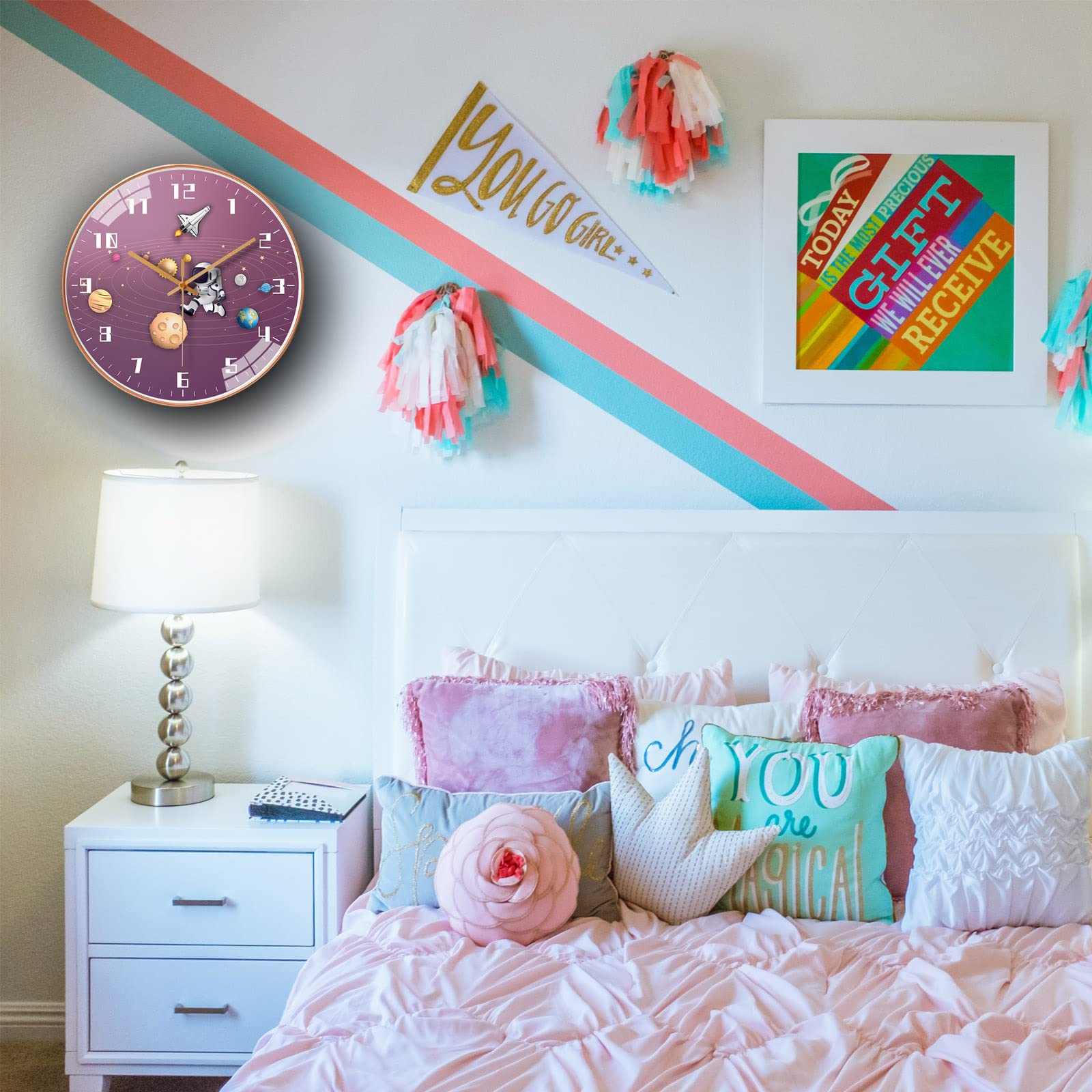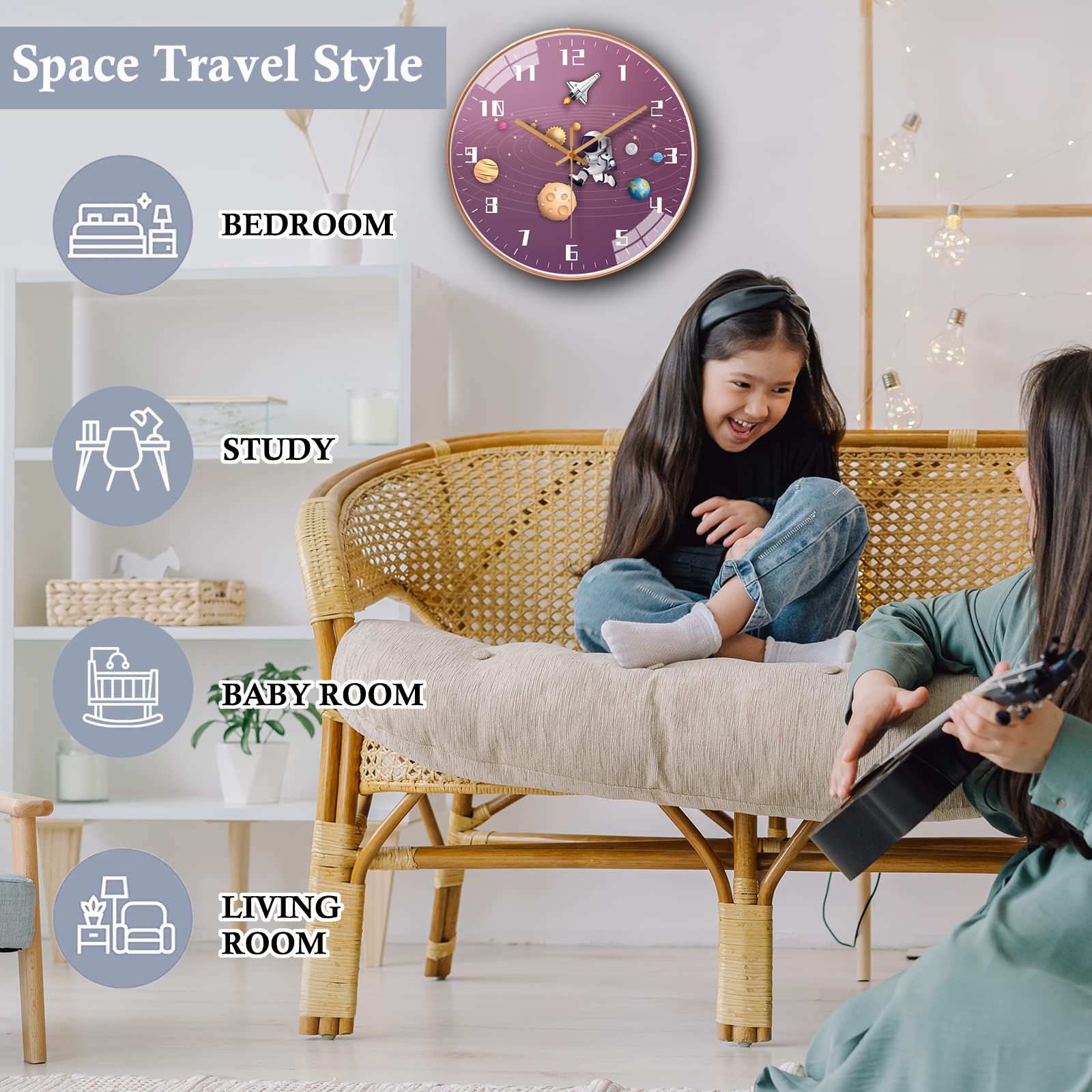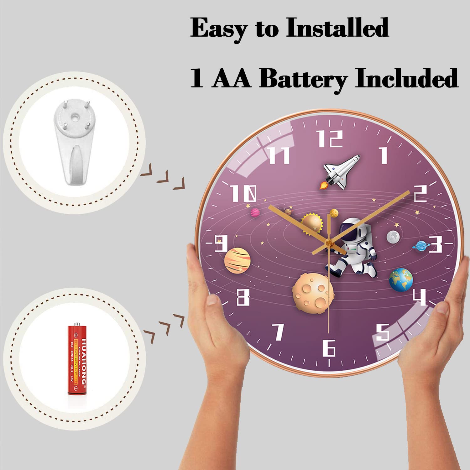 - ➤【Kids Wall Clock with Unique Novel Design】------- This kid wall clock is designed by space travel theme, makes your bedroom full of vitality, and satisfies children to longing for space. Gold borders and hands are classy. Perfect color for boys wall clock matching wall clock is made of high quality materials.