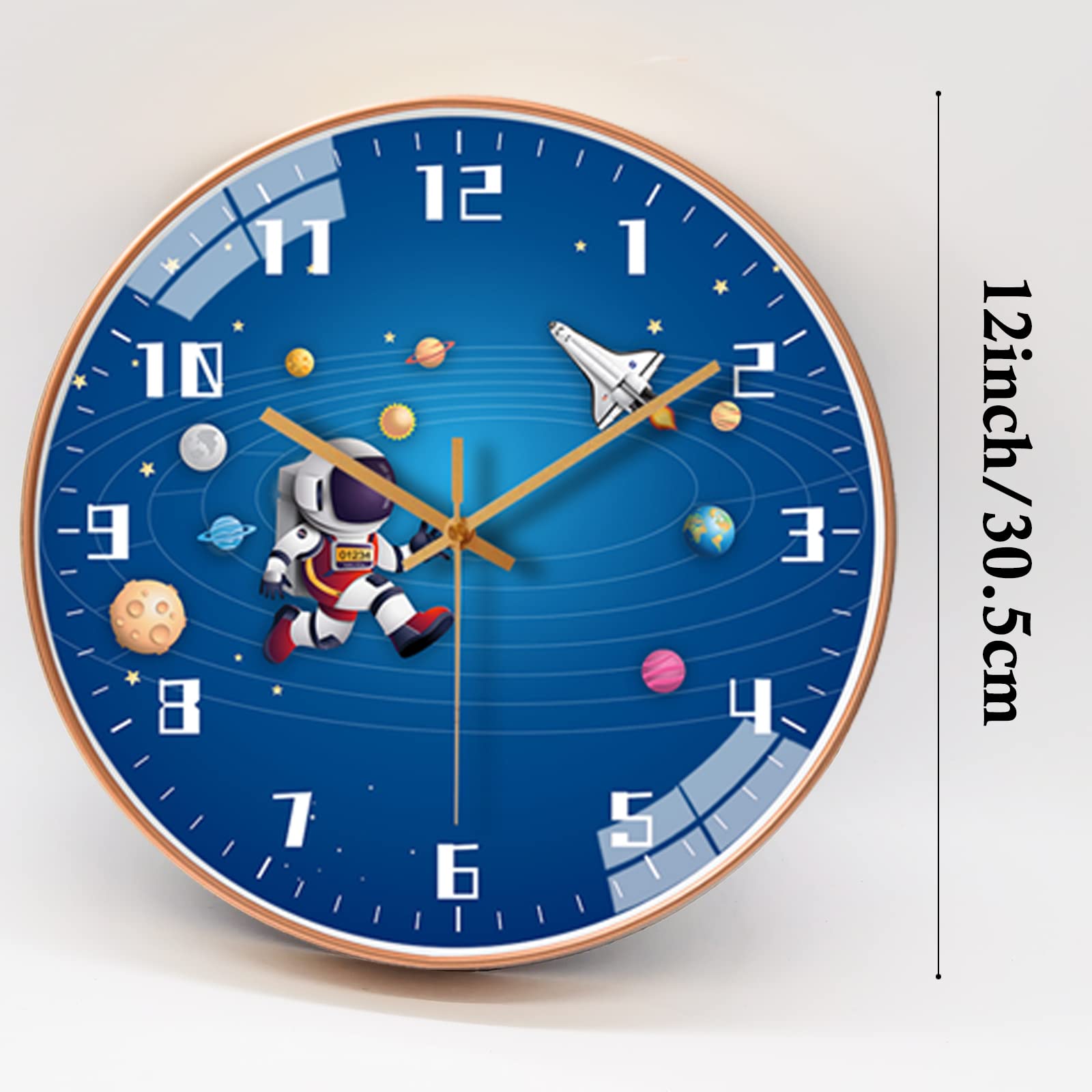 12 Inch Silent Movement Kids Wall Clock, Non Ticking Children Round Wall Clock Battery Operated Space Travel Style Decor Children Clock for School Boys Bedroom Living Room Space Decor (Blue)