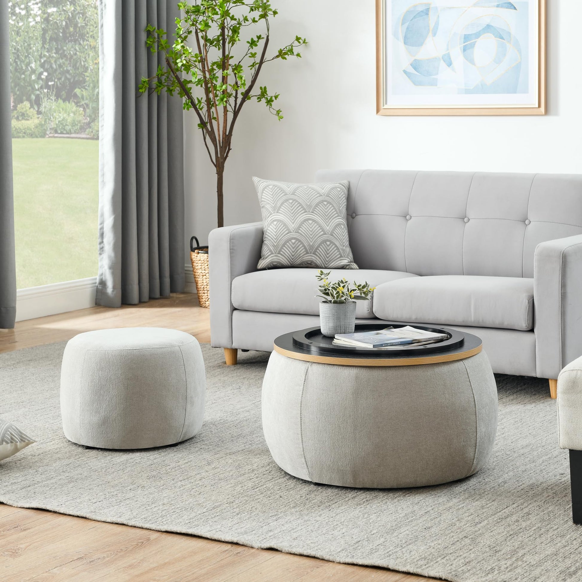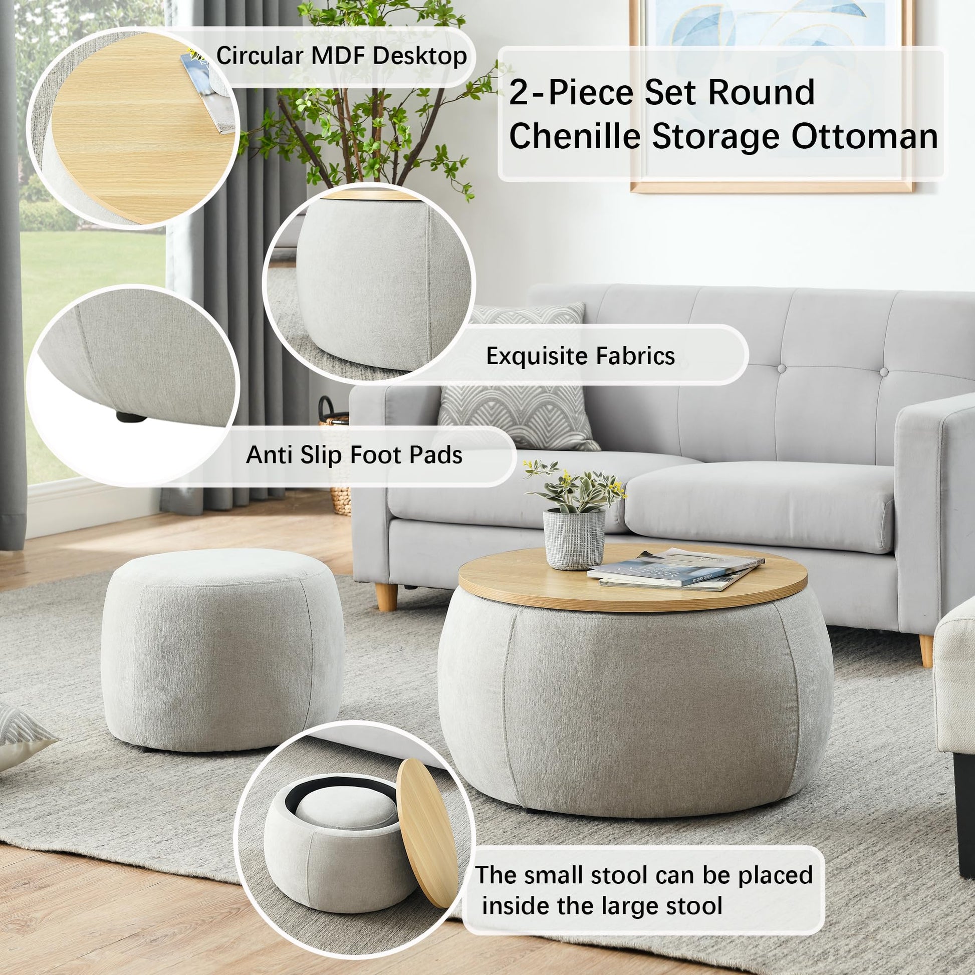 2-Piece Set Round Chenille Storage Ottoman, Equipped with a Drum Shaped Small Stool, Storage Space