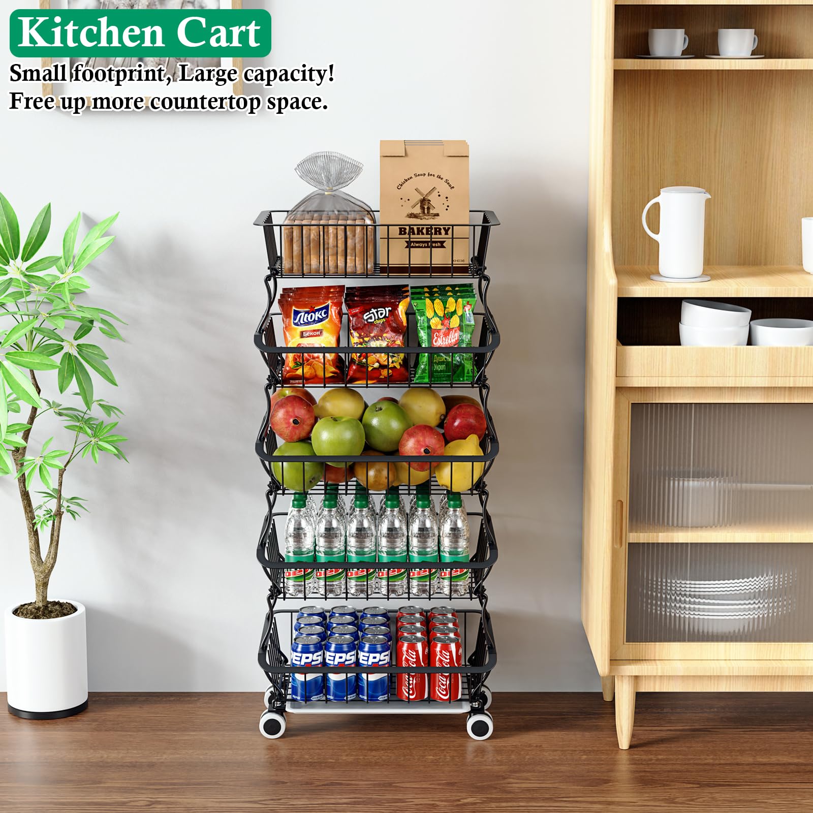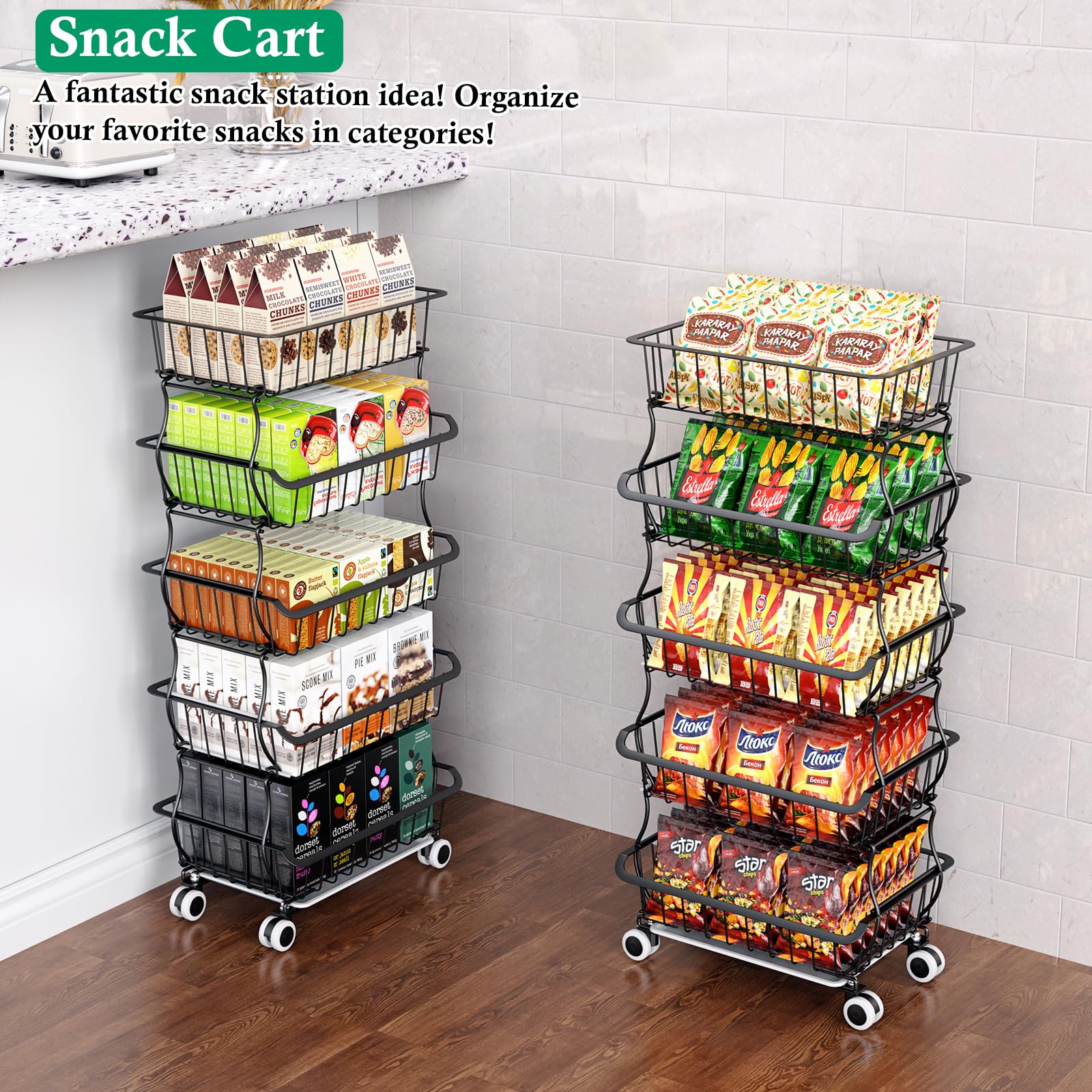 - Floor-mount Storage Cart or Countertop Organizer Option: You can use the No-slip Feet to create a 3-tier fruit basket for the kitchen counter, or set up a 3-tier snack cart with Lockable Wheels under the pantry shelves, organizing your favorite snacks.