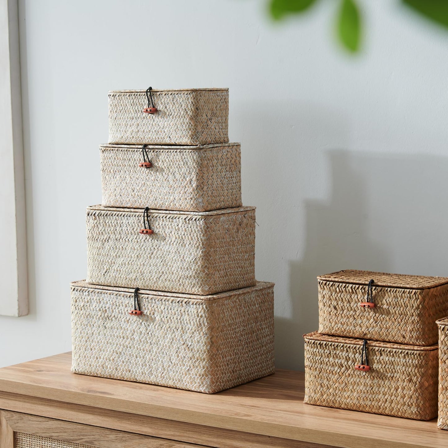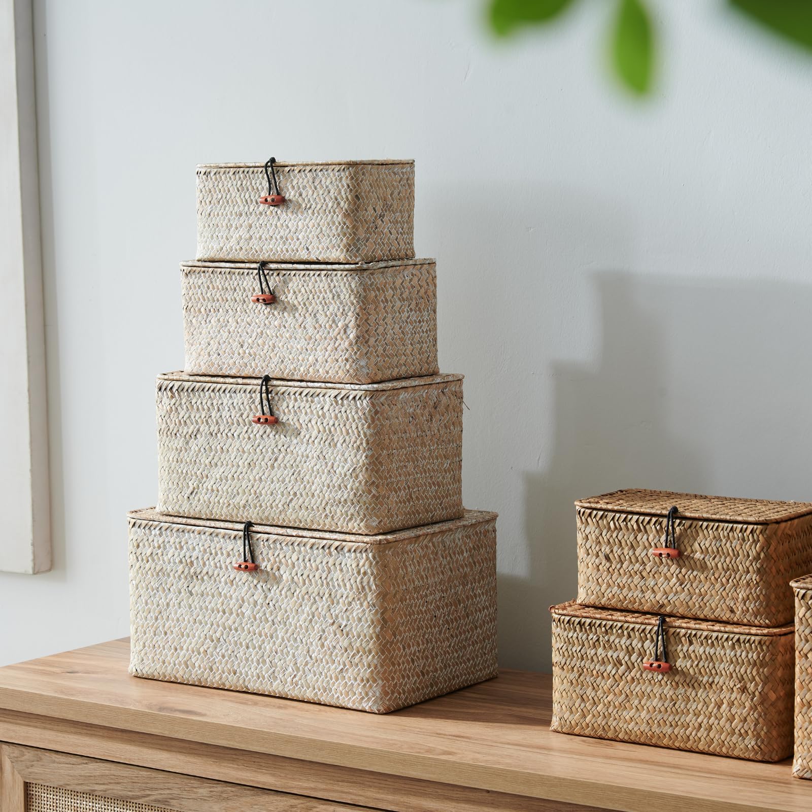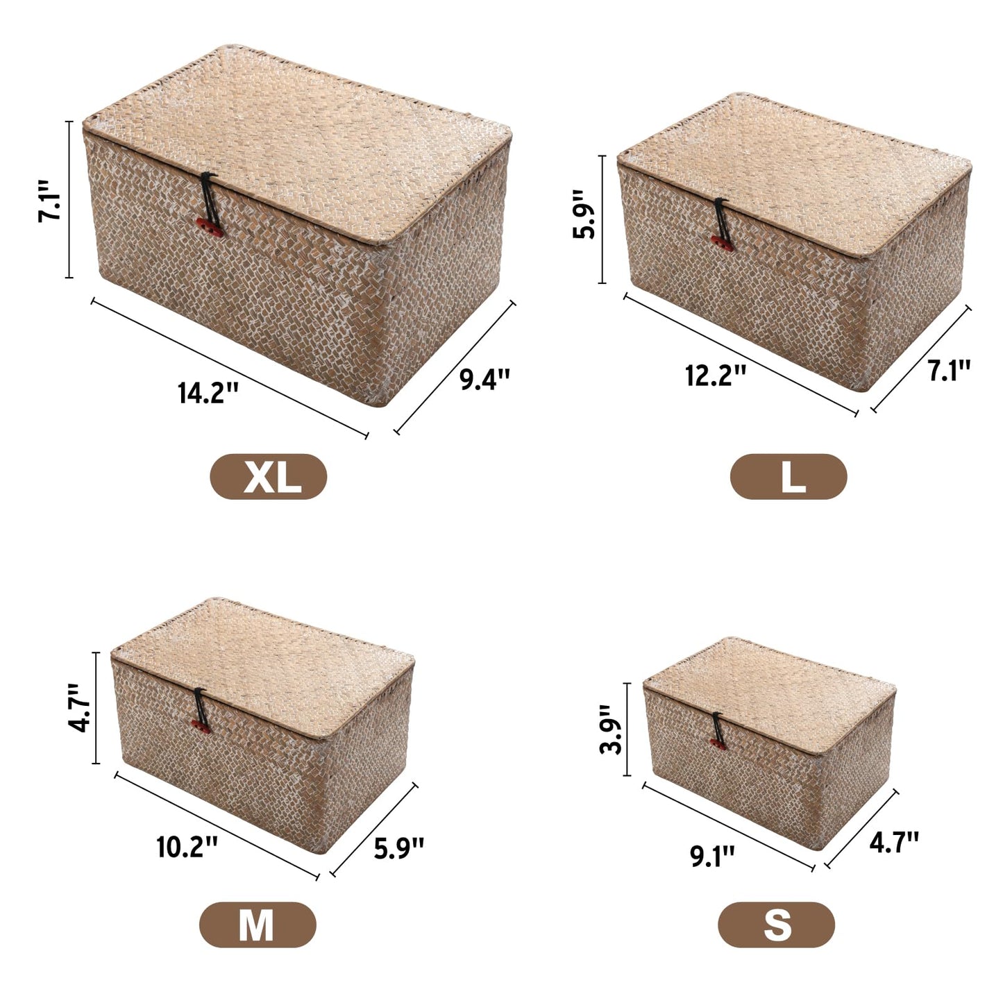 4 Pack, Wicker Baskets with Lids, Nautral Seagrass Storage Baskets, Woven Rectangular Basket Bins, Rattan Storage Organizer for Shelf