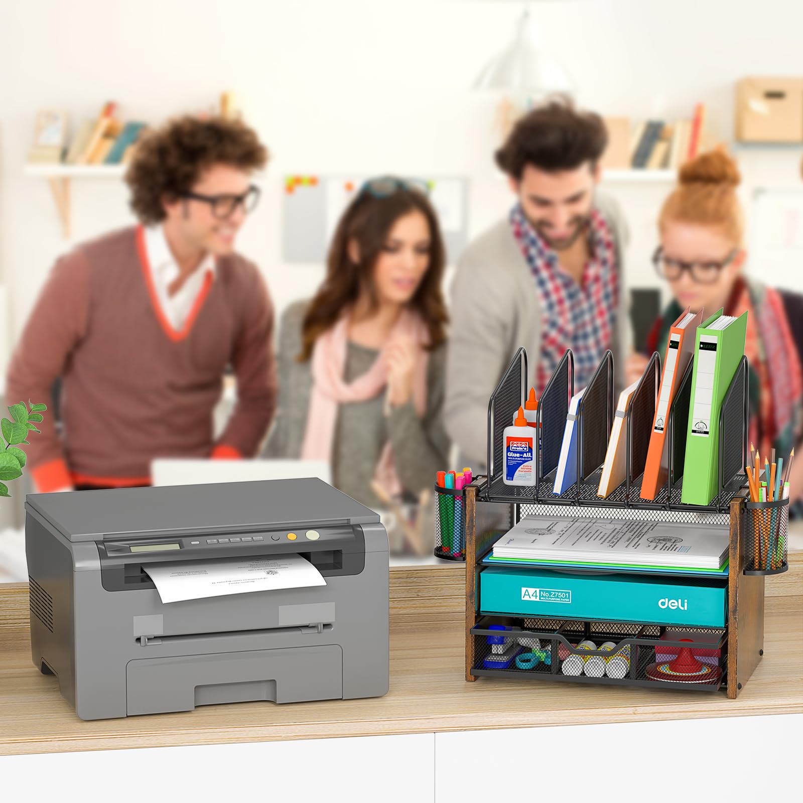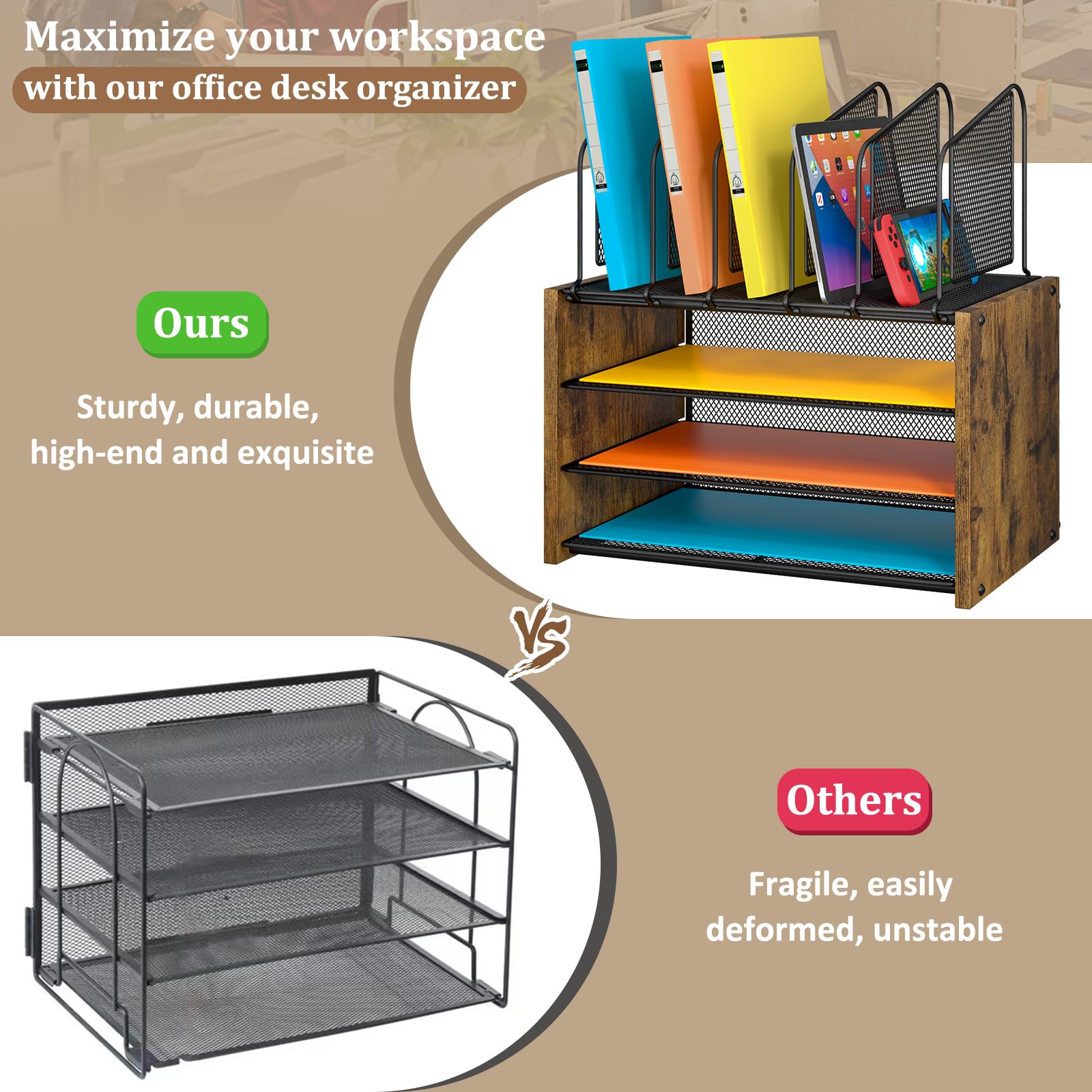4-Tier Mesh Desk Organizer, Wooden Desk File Organizer with 5 Vertical File Holders and 2 Pen Holders, Desktop Organizers and Accessories with Drawer for Home Office