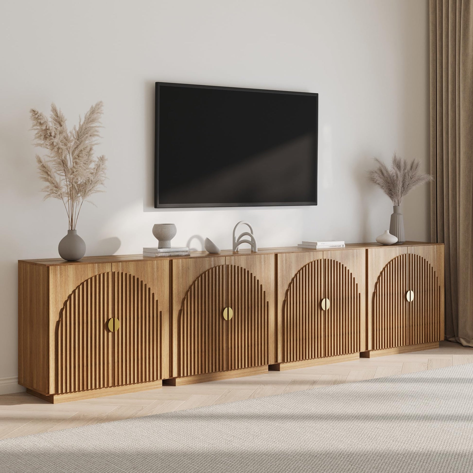 - Harmonious Mid-Century Styling: Featuring symmetrical arched door panels, decorative nail-head trim, and brushed half-circle metal handles, this mid-century modern tv stand set boasts a unified, elegant aesthetic. Each piece flows with a luxurious finish that complements a variety of decor, making it an effortless fit for living rooms seeking a refined, cohesive entertainment center look.