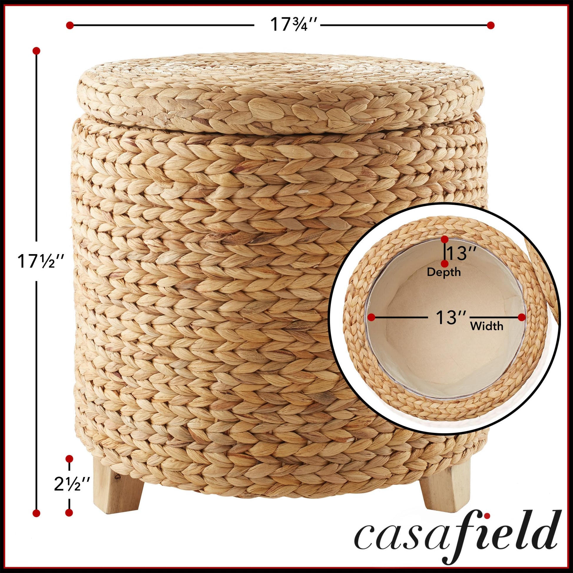 Casafield's storage ottoman with a removable lid and acacia wood feet is crafted from sustainably sourced water hyacinth. This ottoman adds a touch of natural beauty to your decor with its versatile design. The handwoven water hyacinth creates a unique piece that will coordinate with a variety of furniture designs. Its rich textures and earthy hues bring style and warmth to any space, making it a statement accent piece that complements a wide range of interior styles.