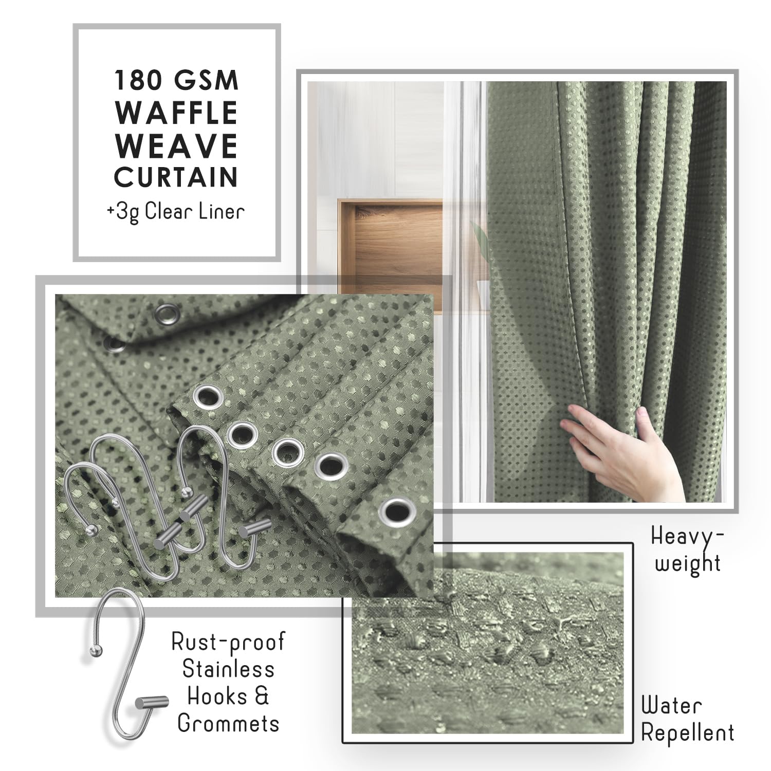 - Black Shower Curtain: Our shower curtains for bathroom measure 72” x 72” and are made of durable, wrinkle-resistant polyester with a waffle texture, and include reinforced header and hook holes.