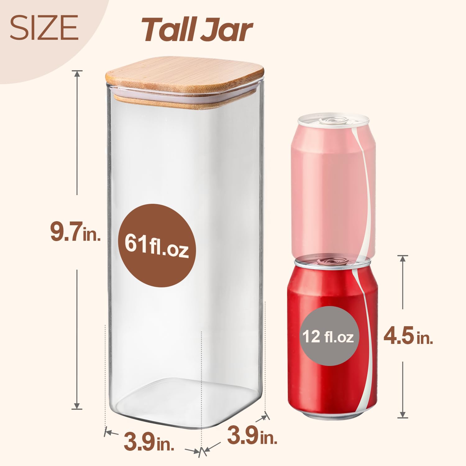 ComSaf Airtight Glass Storage Canister with Lids (24oz/37oz/51oz) Set of 6, Clear Food Storage Container Kitchen Pantry Storage Jar, Glass Jars for Flour Cereal Sugar Tea Coffee Beans Snacks, Square