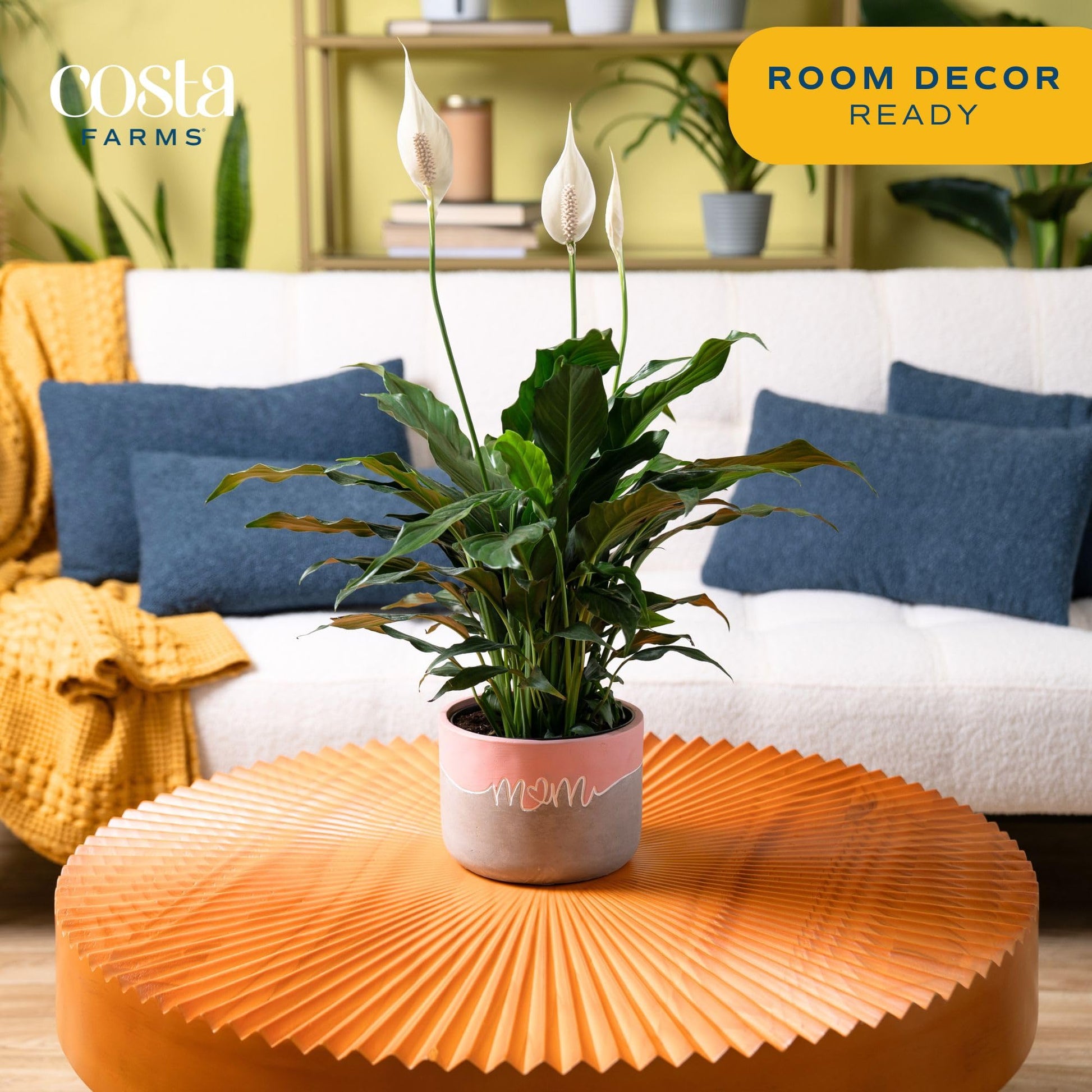 Peace Lily features solid, green foliage. The Peace Lilyis great for tabletops. It does well in spaces that have bright, indirect sunlight. Place Peace Lily in a spot that receives bright light (5 or more hours of sunlight). Water your plant about once a week with approximately 1 cup and be sure all excess water drains away. Adjust as needed for your environment. Do not let the Peace Lily sit in water or overly soggy soil. The height at shipping is approximately 15-inches tall, measured from the bottom of the pot to the top of the plant. The Peace Lily ships in a pink, 6-inch ceramic planter. To avoid water spillage, this container does not have holes. The Peace Lily is a moderate grower. Exact growth rate depends on the care provided and its environment. Give it a boost during the warm months of Spring and Summer with a general-purpose fertilizer that is formulated for potted plants. Follow the instructions on the fertilizer package for the best use. When the plant out grows the current container, it is time to repot. To repot the Peace Lily, gently remove it from its current container and place it into a slightly larger container. Fill in any empty spaces with new and fresh soil and water thoroughly. This plant is considered hardy in USDA Zone 10b-11. Be aware of third-party sellers; other companies try to imitate our quality. There are no other authorized Costa Farms sellers. Look for ships from & sold by to ensure you’re getting our premium plants. Plants are living things; each one is slightly different, so the plant you receive may vary from the photo. Our growers hand-pick the healthiest and highest-quality plants. We package our plants for shipment with great care so they'll arrive at your home ready to be displayed. Shipped fresh from our farm to you, Costa Farms is passionate about delivering happy, healthy, beautiful plants. Costa Farms plants are not intended for human or animal consumption. Keep out of reach of children and pets. Send us your feedback at questions@costafarms.