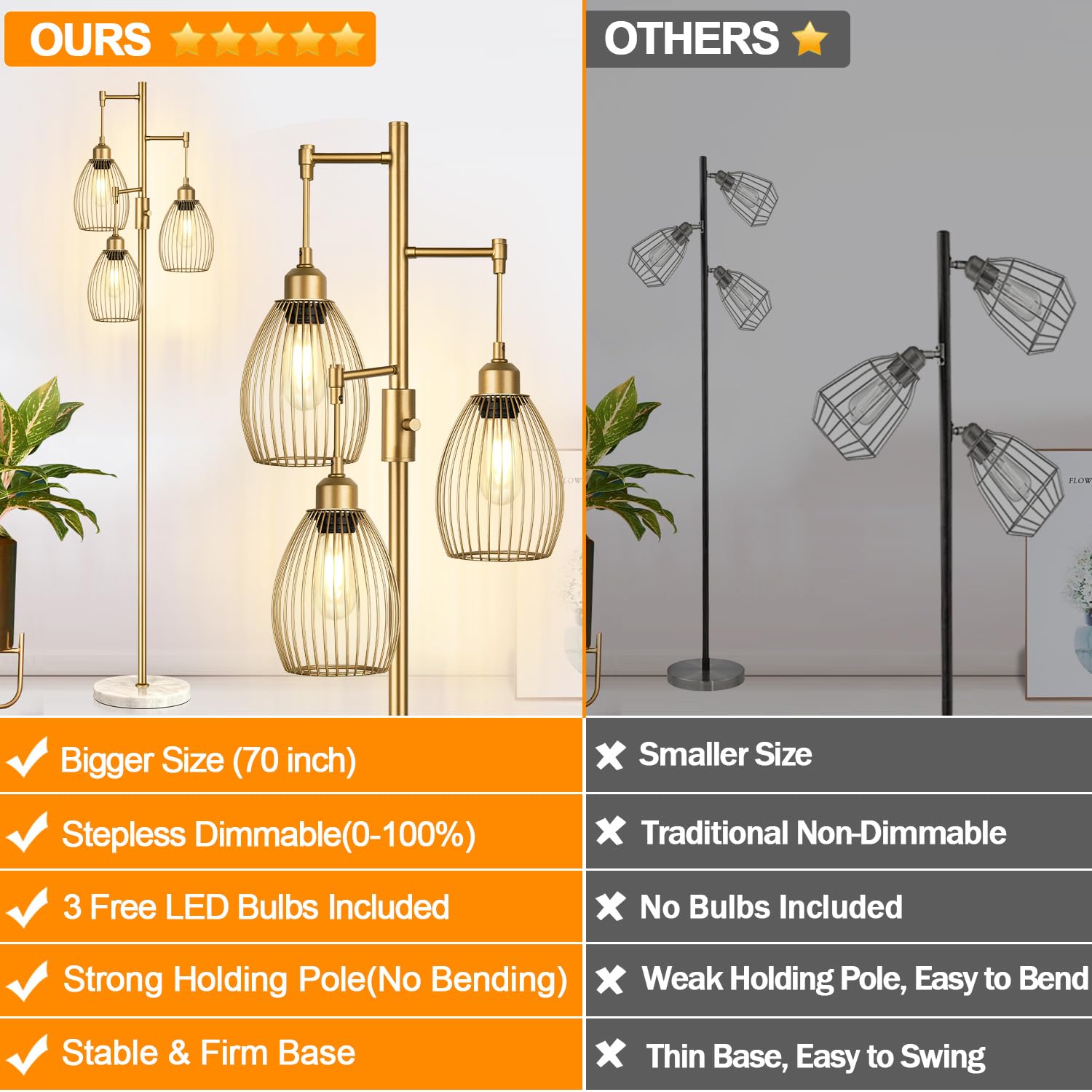 Dimmable Industrial Floor Lamps for Living Room, Gold Tree Standing Tall Lamps with 3 Elegant Teardrop Cage Head & 800 Lumens LED Bulbs