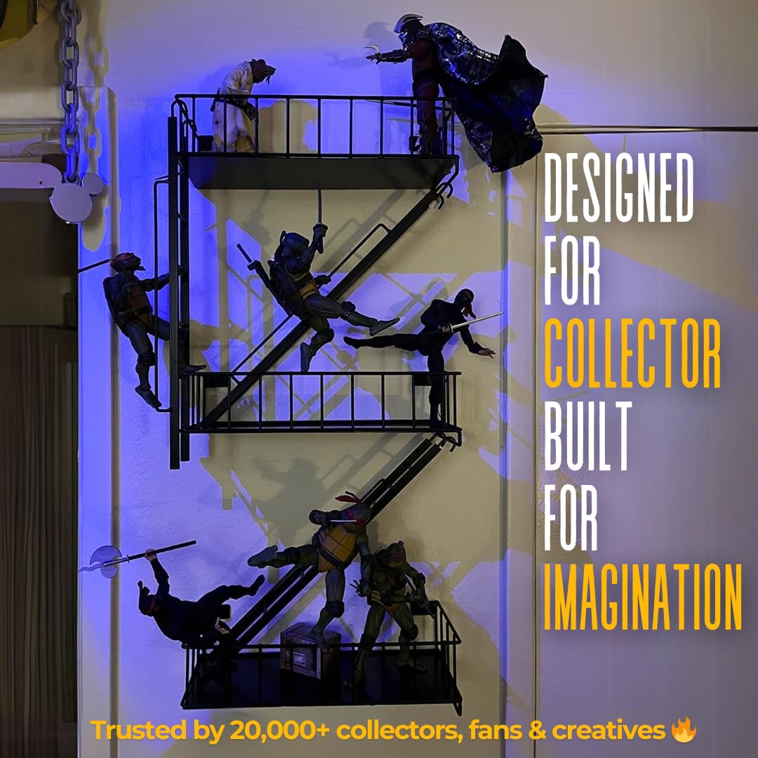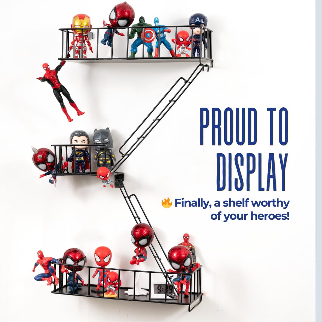 Fire Escape Wall Shelf - New York Metal Decorative Shelf with Screwdriver & Screws, Rustic Wall Shelves for Bedroom, Home Décor, Action Figure Display (3-Tier Black Floating Shelves)