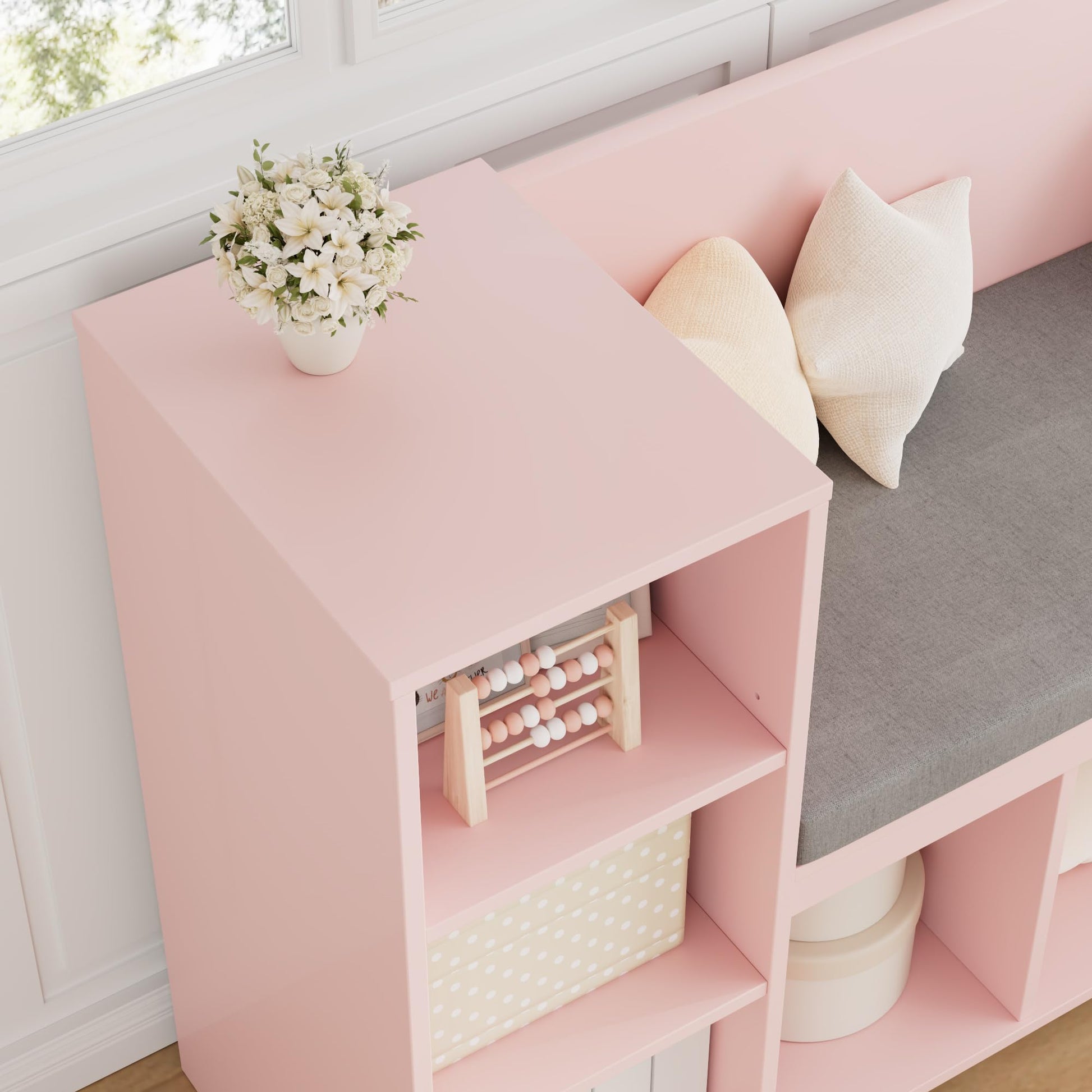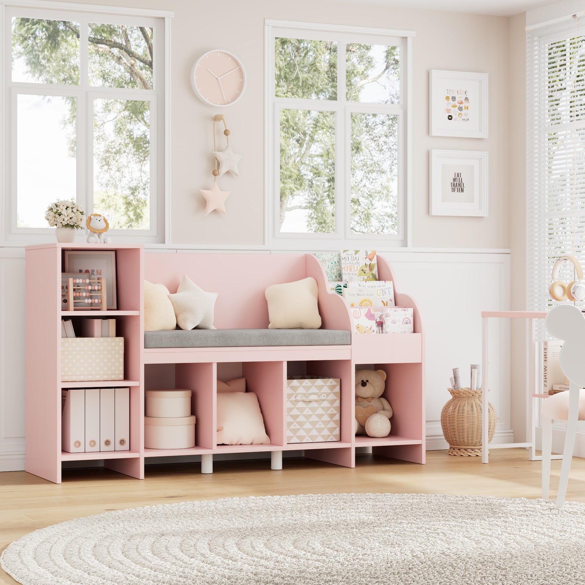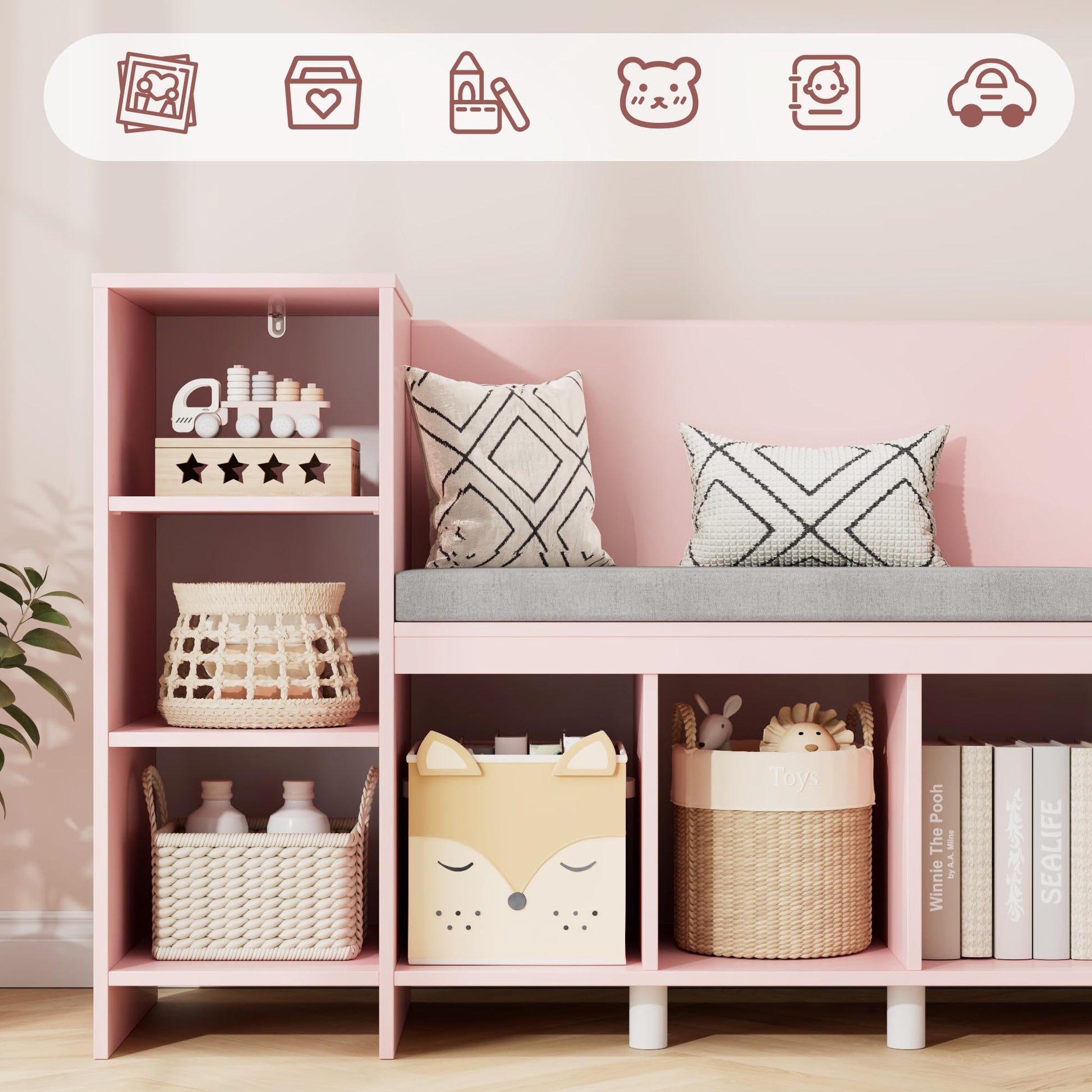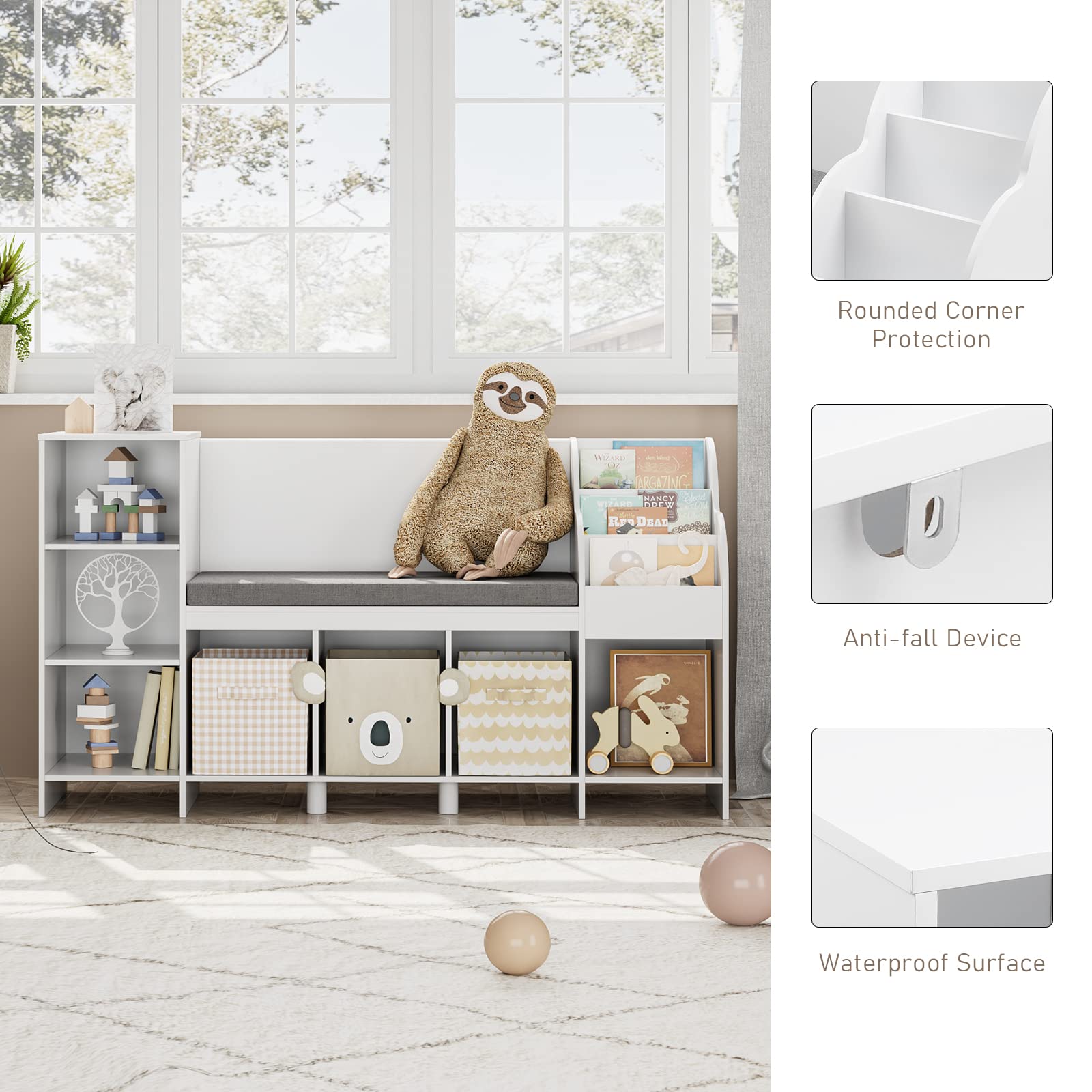 HOUSUIT 55" Kids Bookshelf with Reading Nook, Bookcase with Seat Cushion and Storage Cubbies, Kids Reading Nook with Adjustable Shelf, Toy Organizers and Storage with Bench for Playroom, White