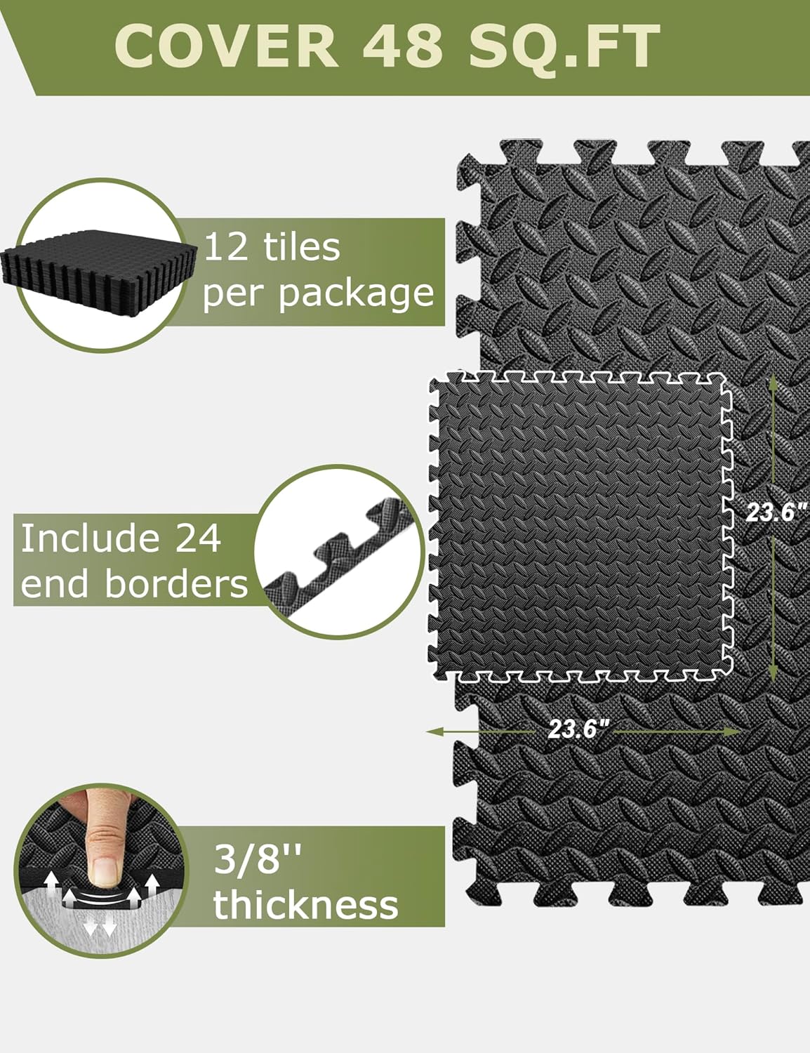 - Gym Floor Mats Cover 48 SQ. FT: Each foam floor tile measures 23.6 inches x 23.6 inches x 3/8 inch (600mm x 600mm x 10mm). Package includes 12 BLACK interlocking foam tiles and 24 end borders for a seamless appearance. Gym flooring cover up to 48 sq.ft of floor space, making it a perfect workout and training accessory.