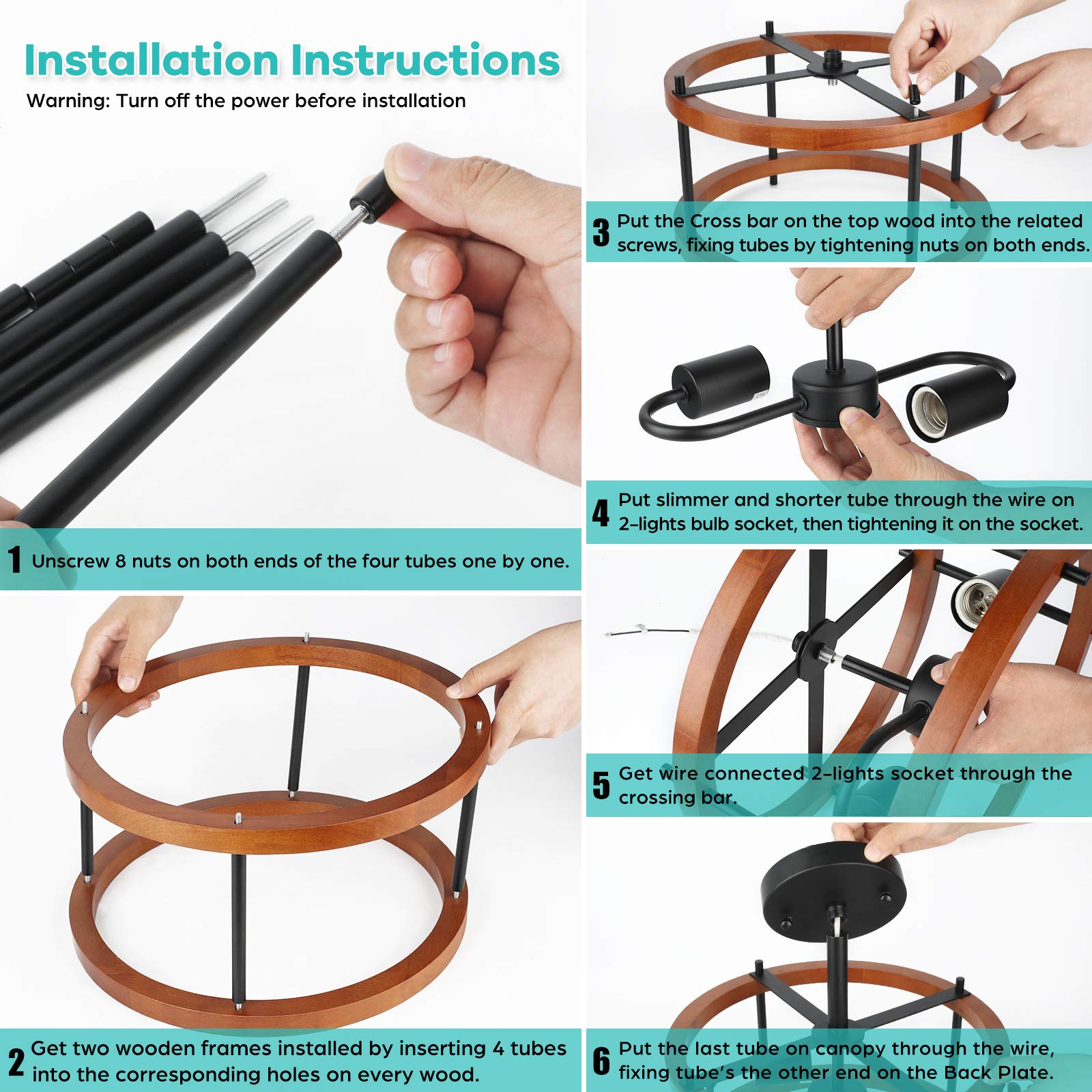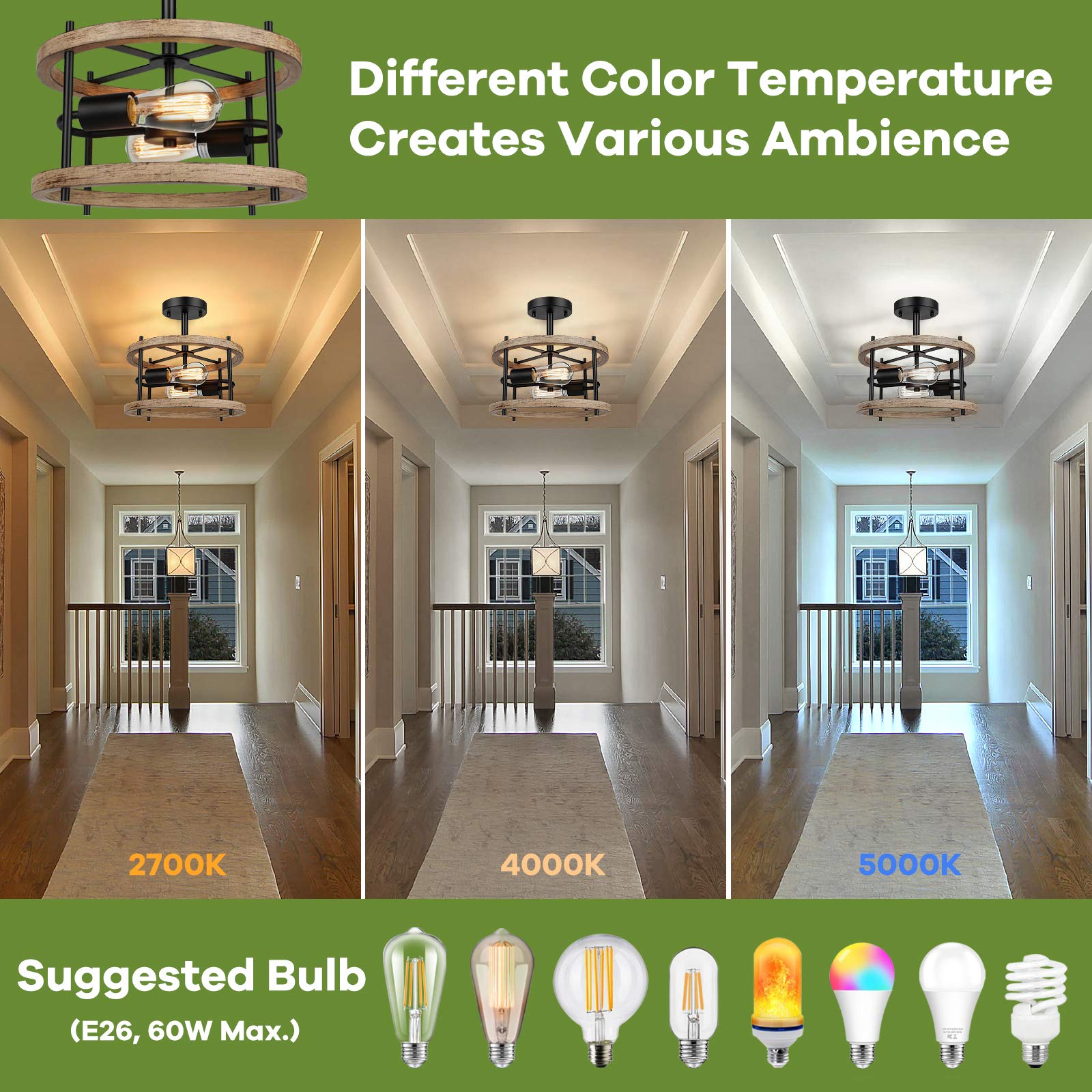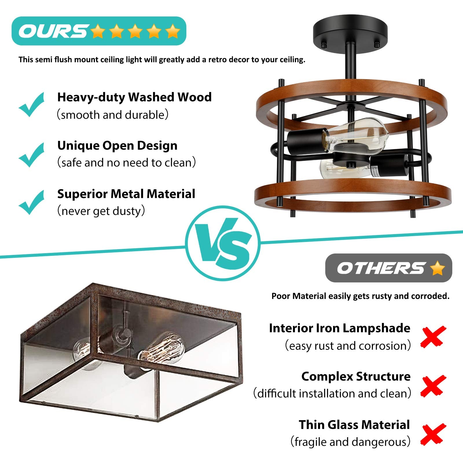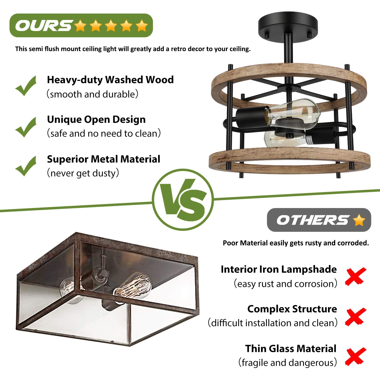 Lakumu 2-Light Retro Semi Flush Mount Ceiling Light Fixture, Rustic Vintage Wood Ceiling Light Black Metal, Industrial Farmhouse Ceiling Lamp
