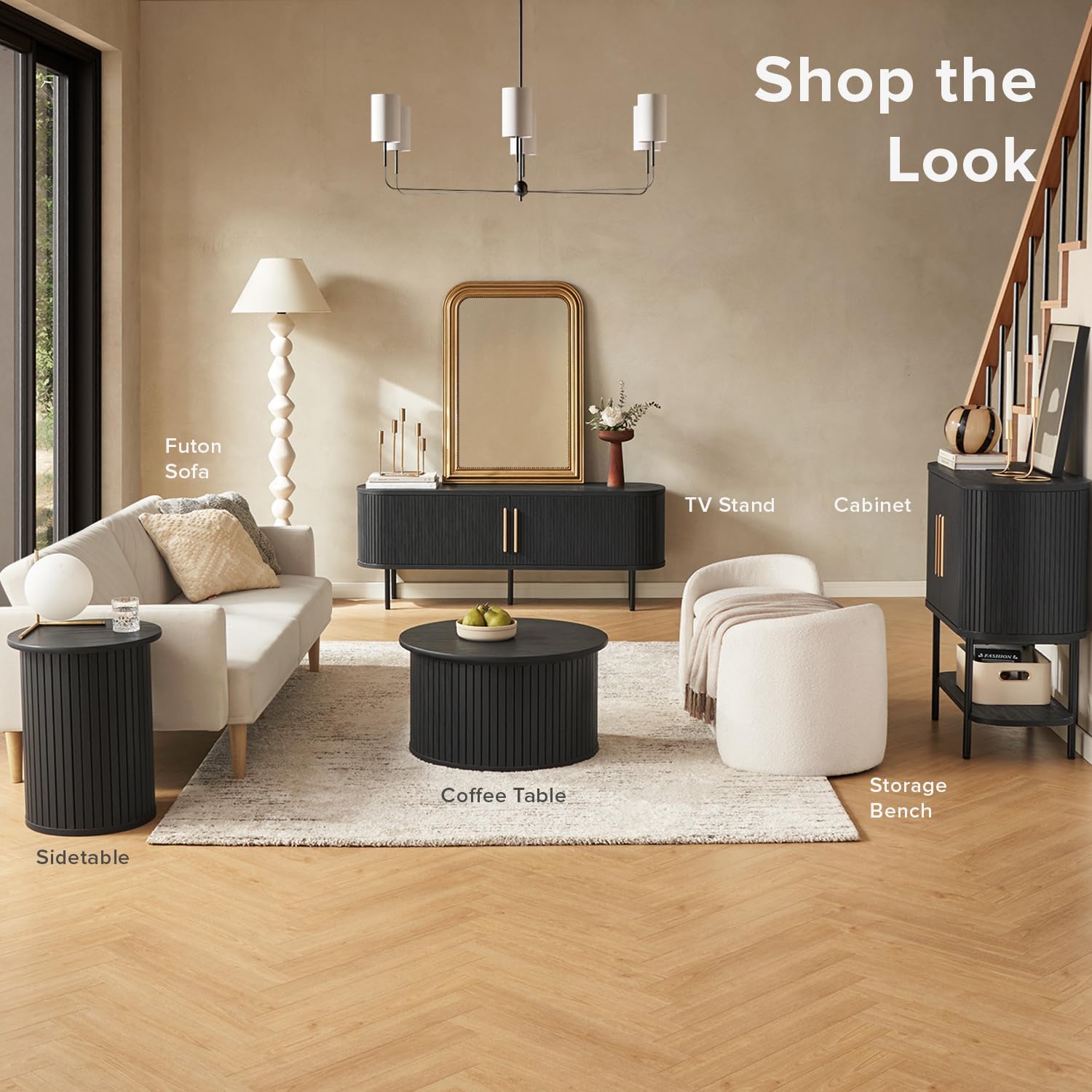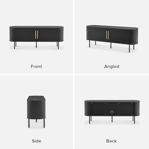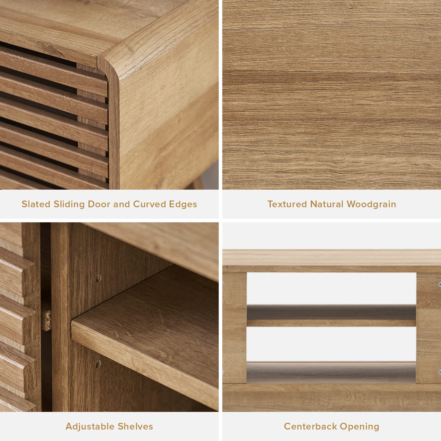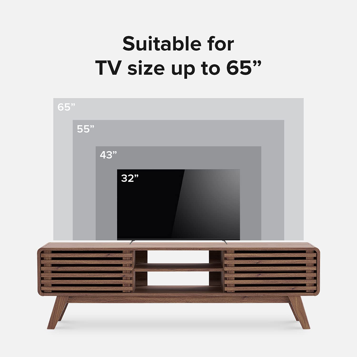 - Design: Mid-century modern TV stand with slatted door design and adjustable shelves. Multiple storage spaces for your consoles