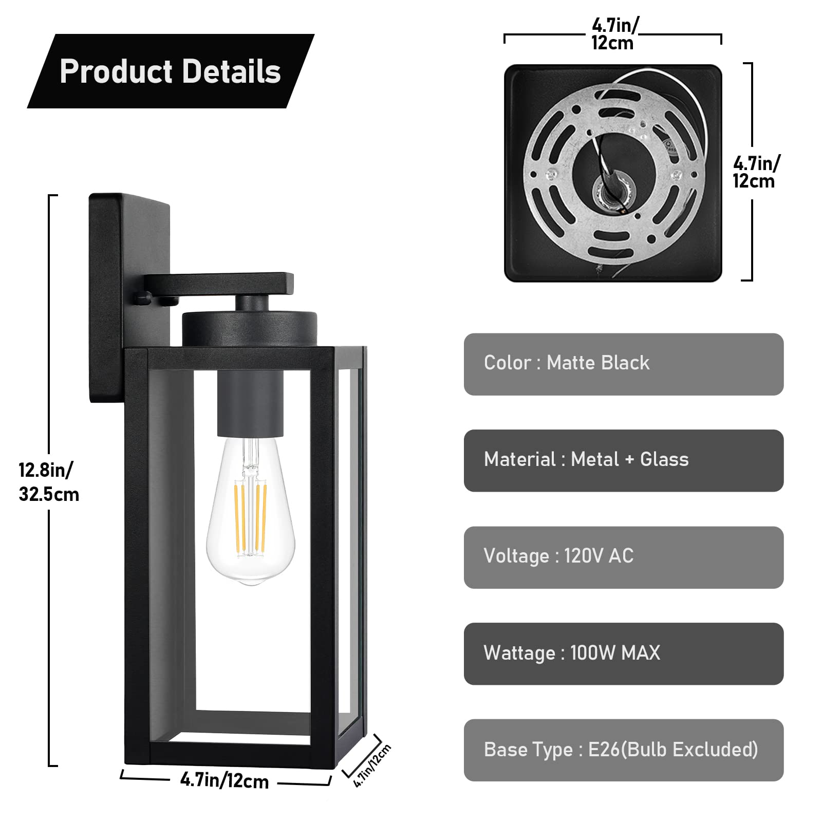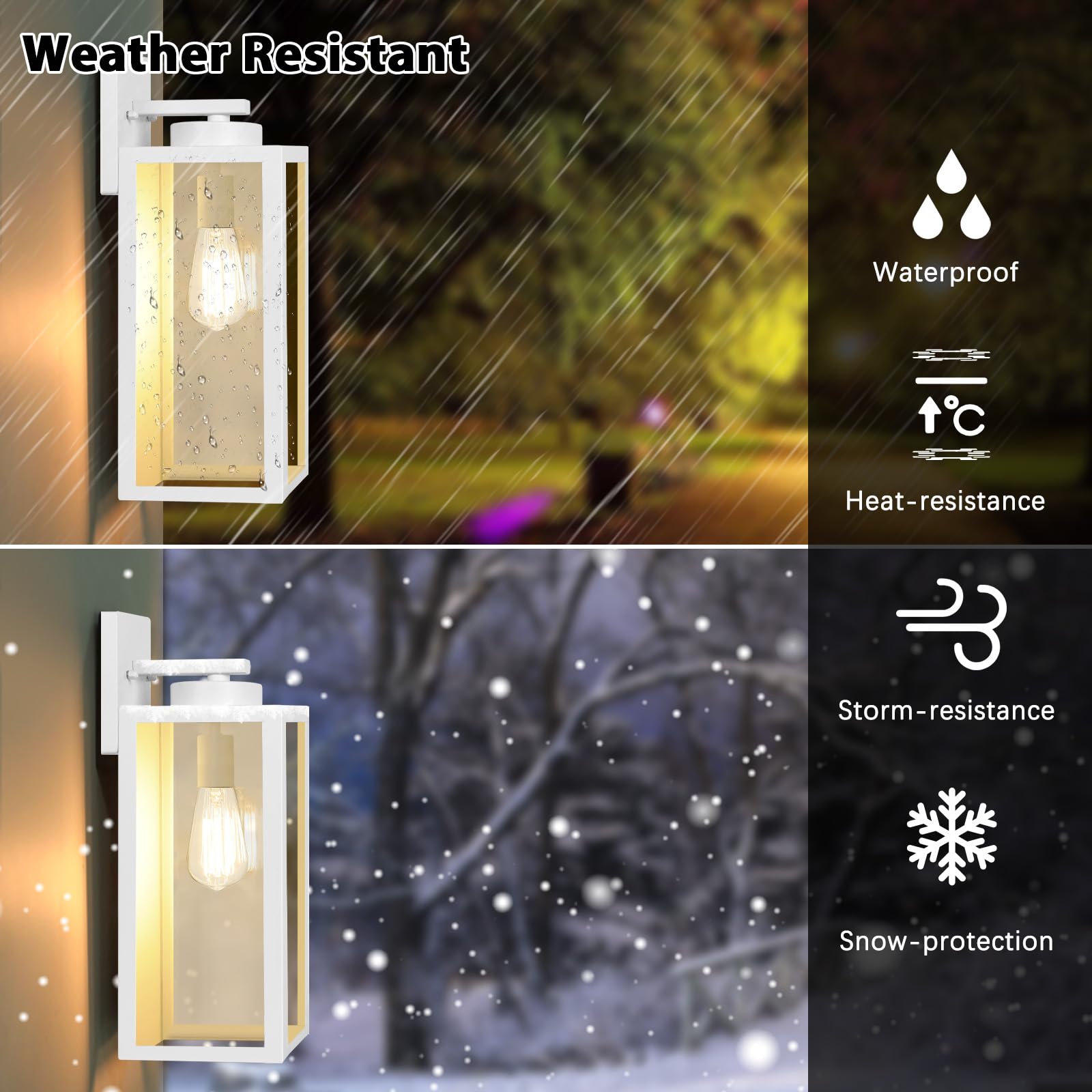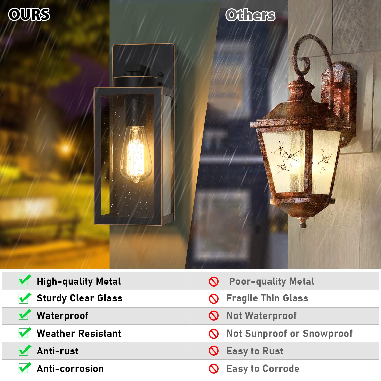 - Weather-resistant Wall Lanterns: Constructed with sturdy metal frame and thickened glass panel, our outdoor wall sconce is waterproof and durable enough to withstand any weather changes, from sun to snow, rain to ice. The high-quality metal effectively prevents the wall light from rust or corrosion to keep its stylish look for years of usage.
