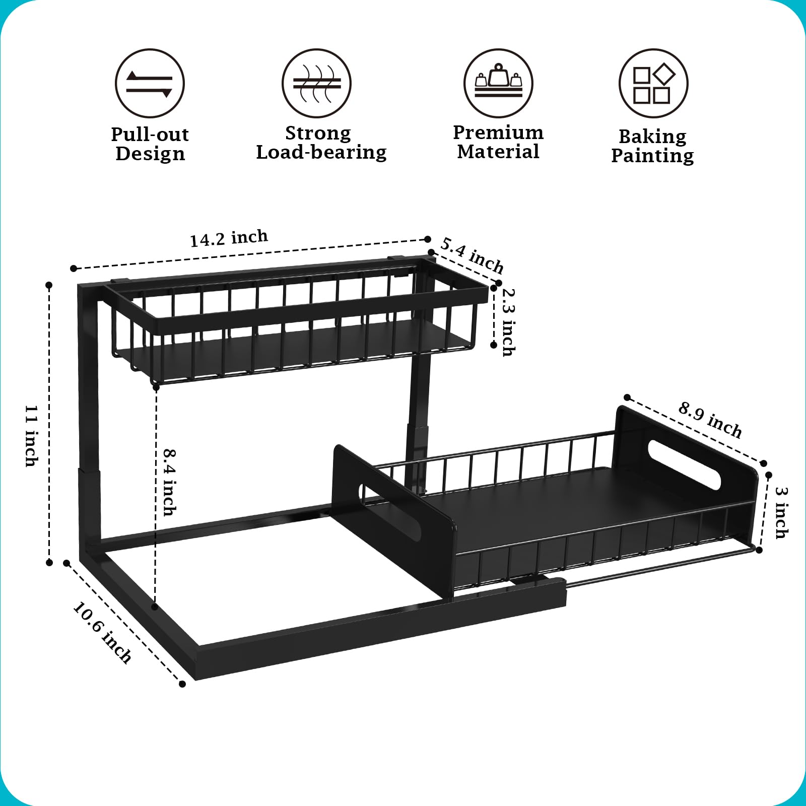 Under sink organizer ideal for sinks, bathrooms, kitchens, pantries, and offices. Can be used as bathroom toiletries storage, kitchen spice rack or office supplies rack, etc. Make Your Home More Organized and Beautiful.