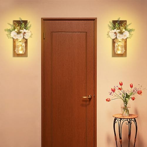 - ENCHANTING VALENTINE'S DAY: The beautifully crafted look of the Mason Jar Wall Sconce Wall Decor with bright LED lights adds a touch of warm and chic color to your décor, bringing more holiday cheer to you and your family. At night, surround yourself with stars and chirping insects in a rustic home decor house. Enjoy the soothing lights, graceful white peonies and eucalyptus leaves, simple and stylish, with a strong European flavor.