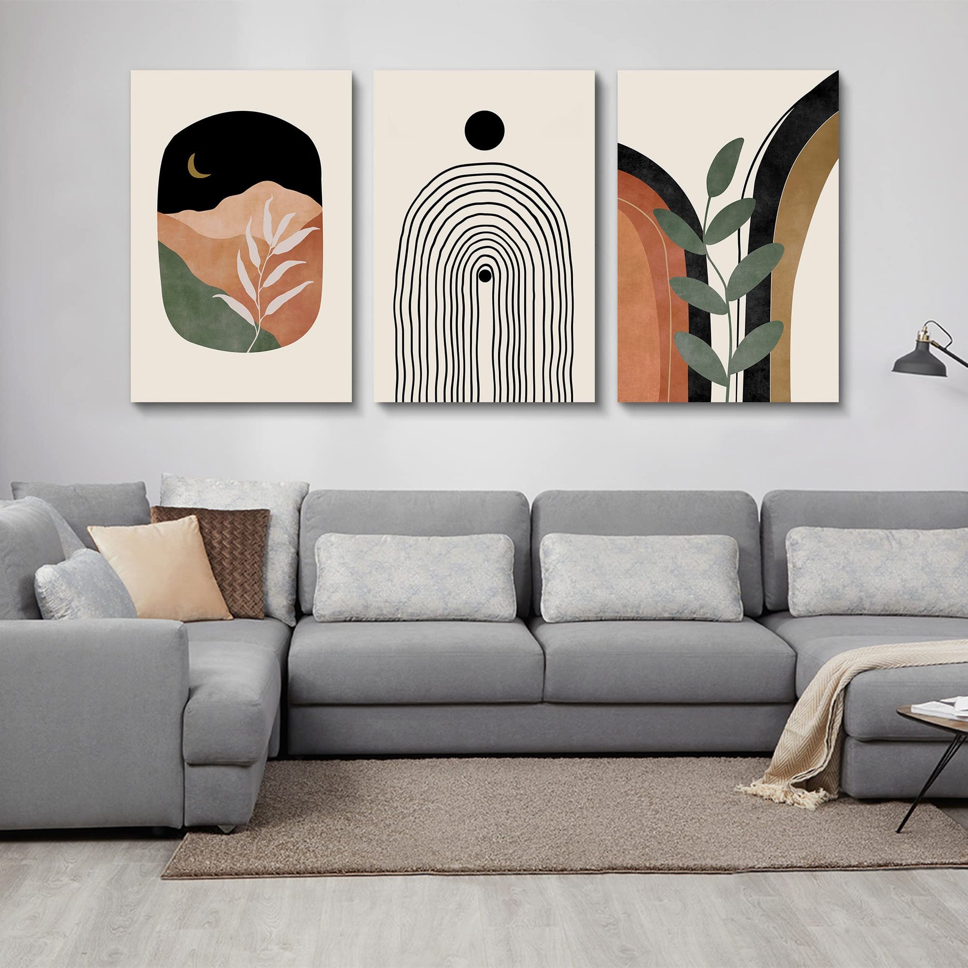 Minimalist Boho Wall Art Set of 3, Mid-Century Modern Wall Art, Framed Canvas Wall Art Moon Botanical Geometric Neutral Abstract Artwork Prints