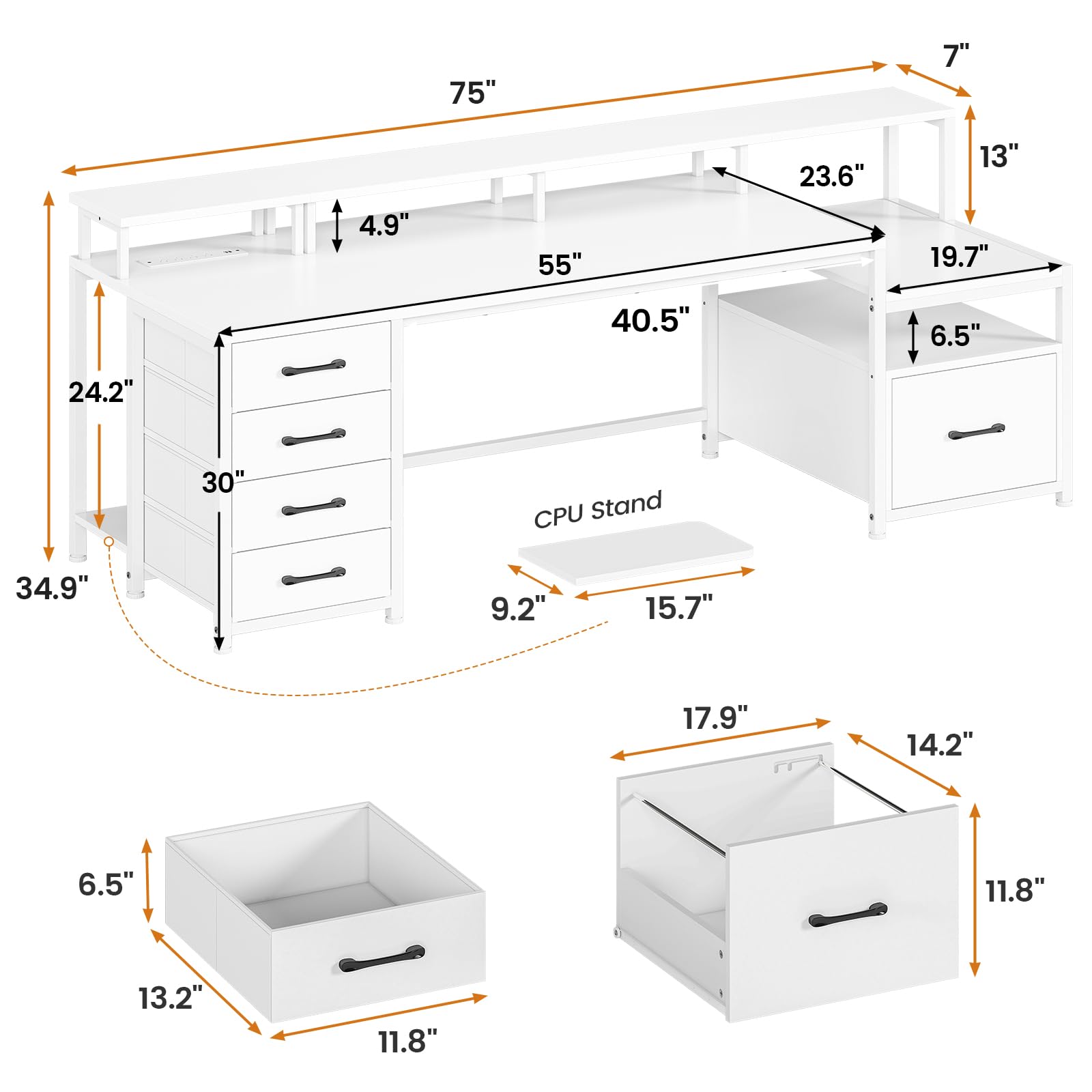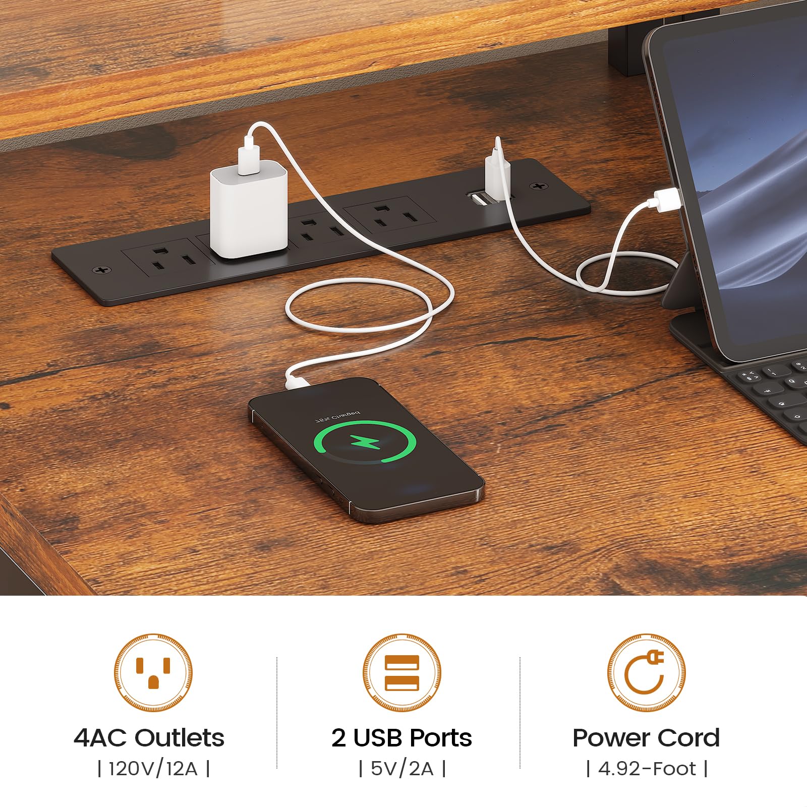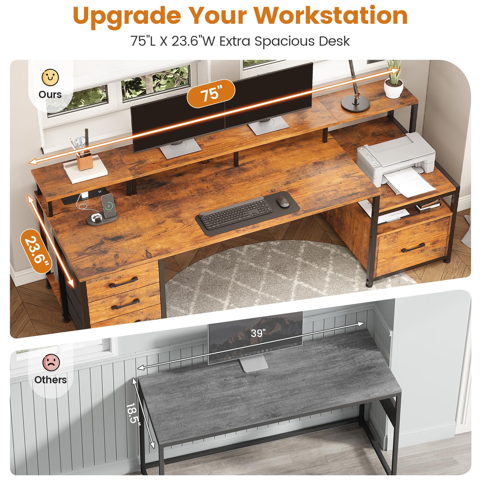 67"(L)*18.5"(W) dimension can easily accommodate your laptop, keyboard, books, files, and desk accessories. The large workstation can hold 2 computers at the same time.