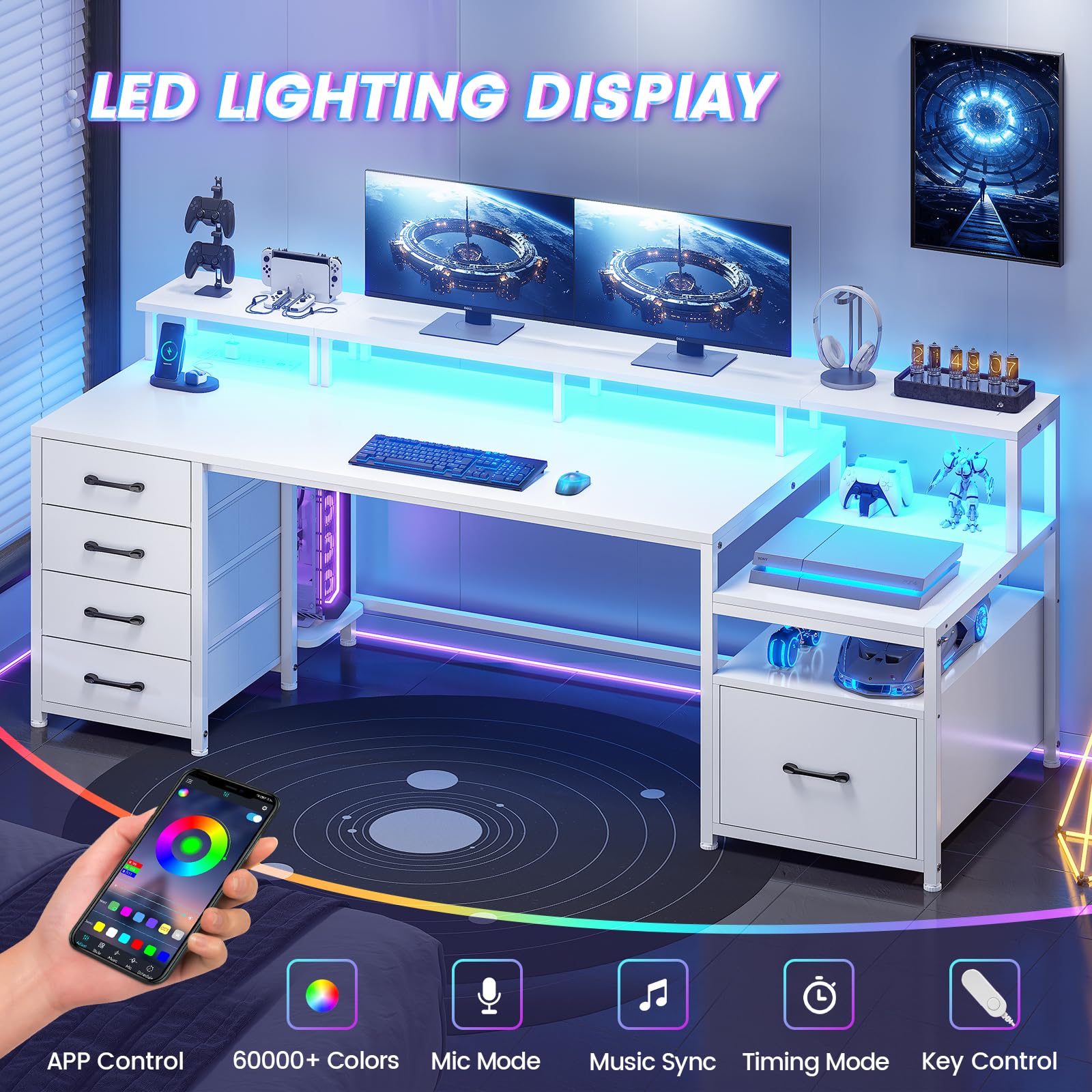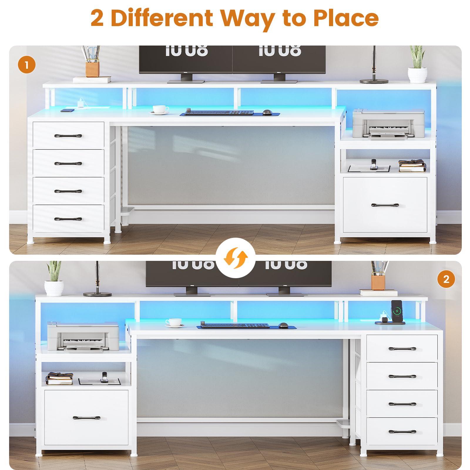 SEDETA Home Office Desk with File Drawer & Power Outlet, 66'' Computer Desk with 5 Drawer, Storage Shelves, Printer Cabinet and Monitor Shelf, Gaming Desk with Led Lights, Rustic Brown