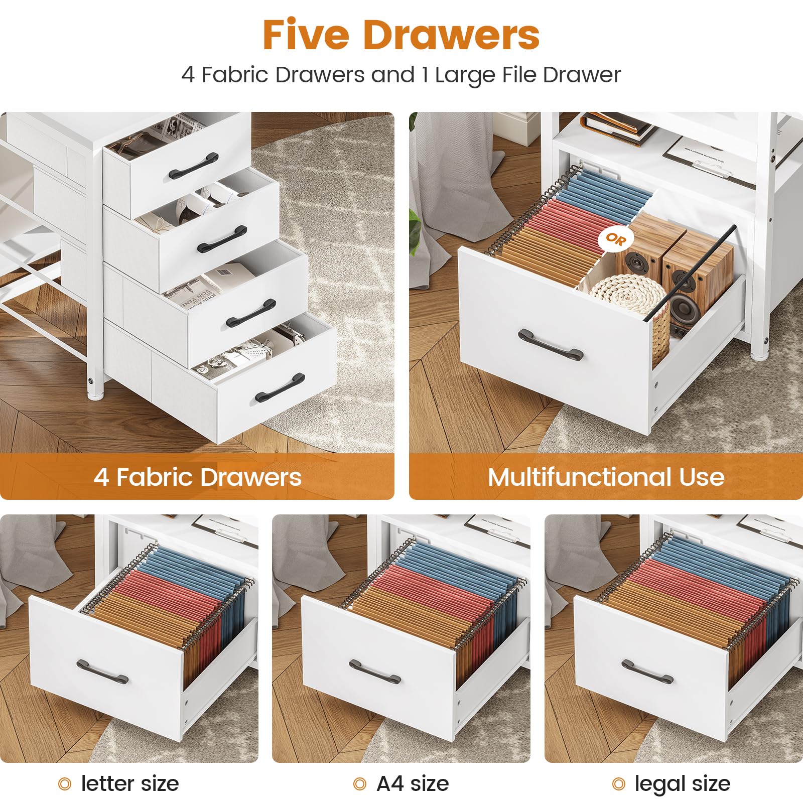 The SEDETA computer desk provides 5-tier easy to assemble fabric drawers, drawers are made of breathable high-quality fabric, lightweight and easy to install. Which gives you plenty of under-desk storage space to help you store your books, work files and small office stuffs, make your work and study more efficient.