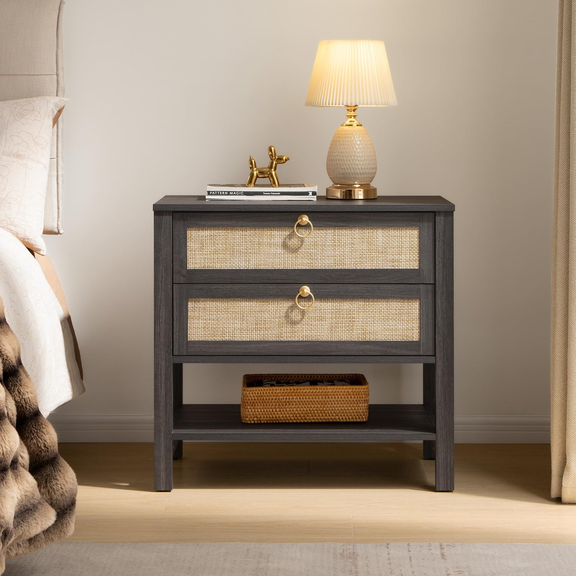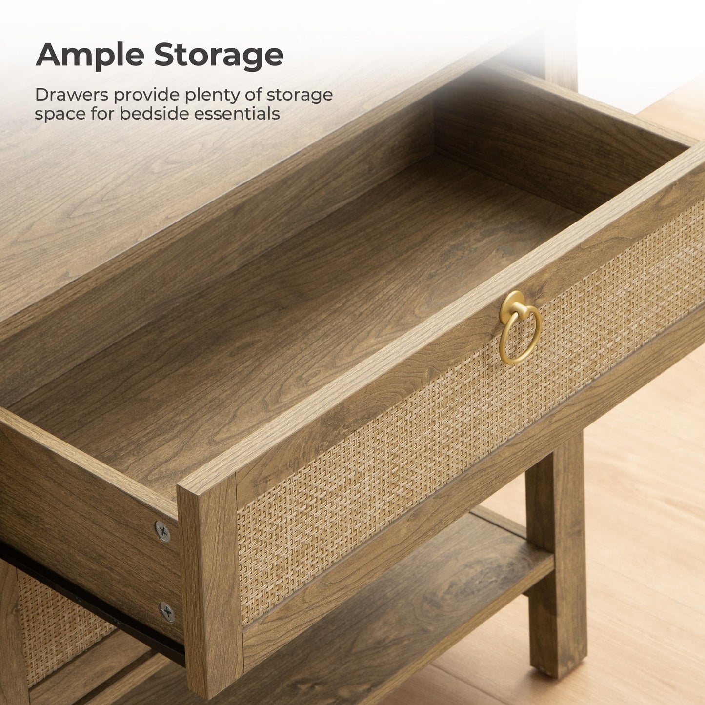 - 【Ample Storage】Keep your essentials close at hand with 2 spacious drawers and a convenient storage shelf. Say goodbye to clutter and hello to organization! From books and journals to bedside essentials, our rattan nightstand set of 2 provides plenty of space to keep your belongings neatly tucked away yet easily accessible.