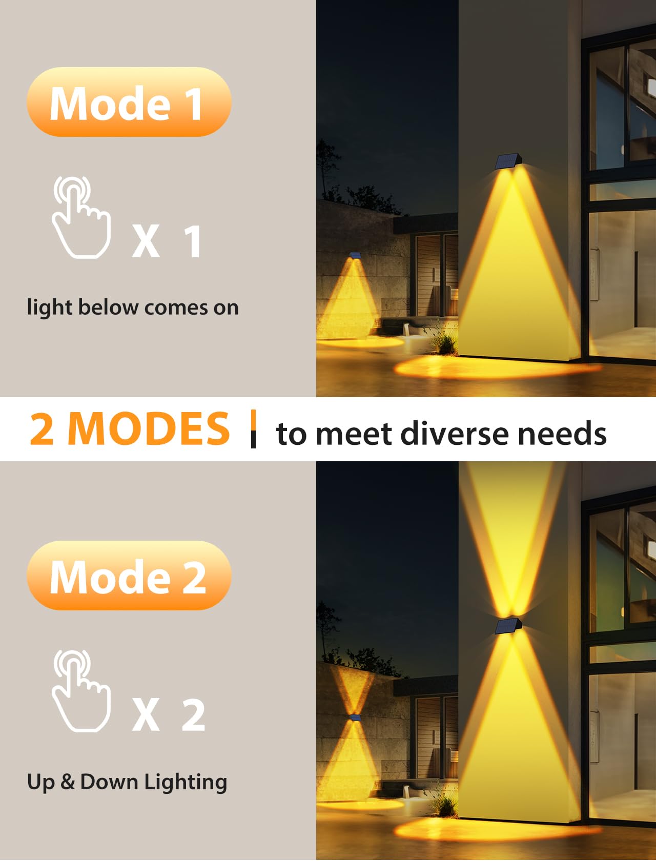 [ Upgraded Super Brigh Lens LED 】 :Each solar wall light comes with 4 LEDs that are amplified by convex lenses to concentrate the light distribution. With 100 Lumens up and down bright light from each solar deck light, you are able to see wider areas more clearly at night. Solar lights with lenses appear brighter than lights without lenses, which means you only need fewer solar lights to create the same or better lighting effect than other lights in the same area.