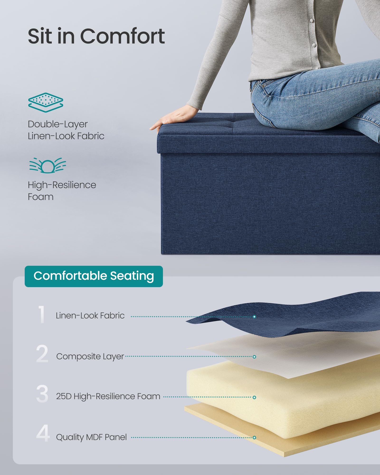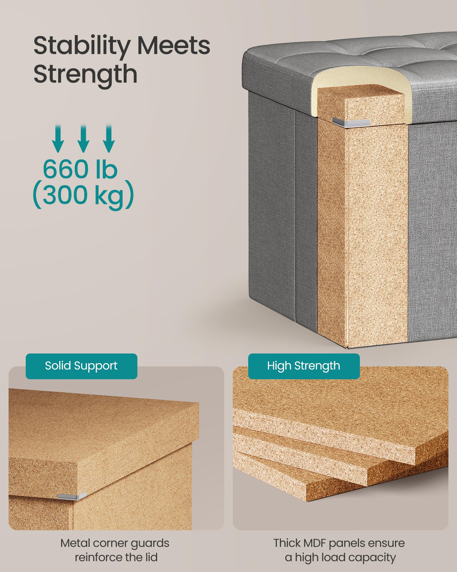 - 【STURDY AND DURABLE】Built with premium MDF panels and reinforced with metal corner guards on the lid, this ottoman is strong enough to support up to 660 lb (300 kg), making it a reliable seating or storage solution that will stand the test of time