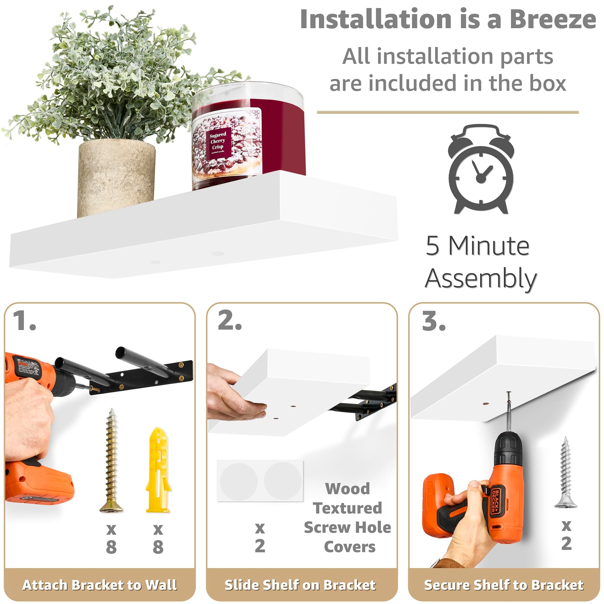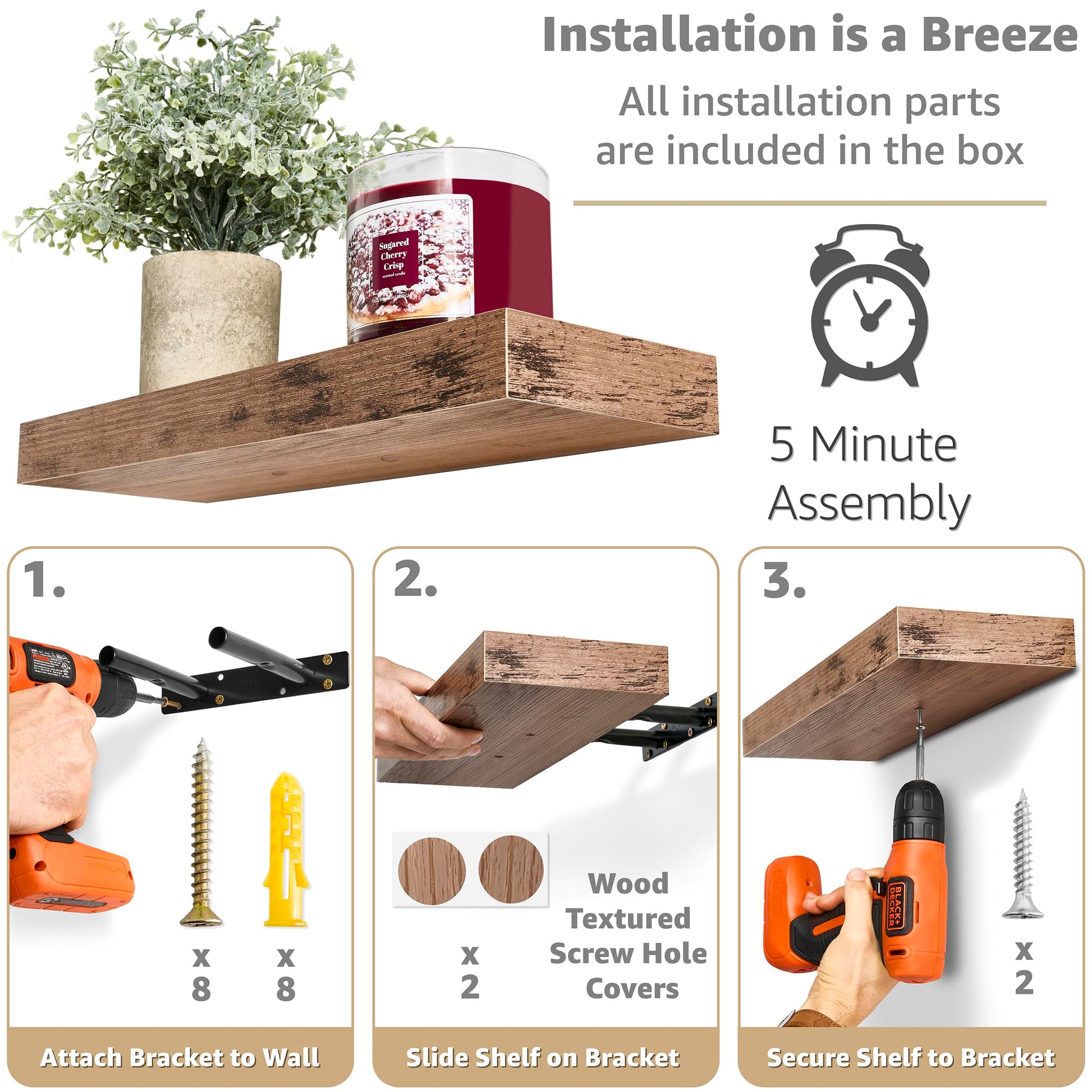 It features a rectangular silhouette with a wood finish for rustic appeal. With a timeless look, this floating shelf fits most decor & can be installed virtually anywhere! Fill an empty wall space above a desk, fireplace, entryway, between windows, office, bathroom shelves over toilet, and more.