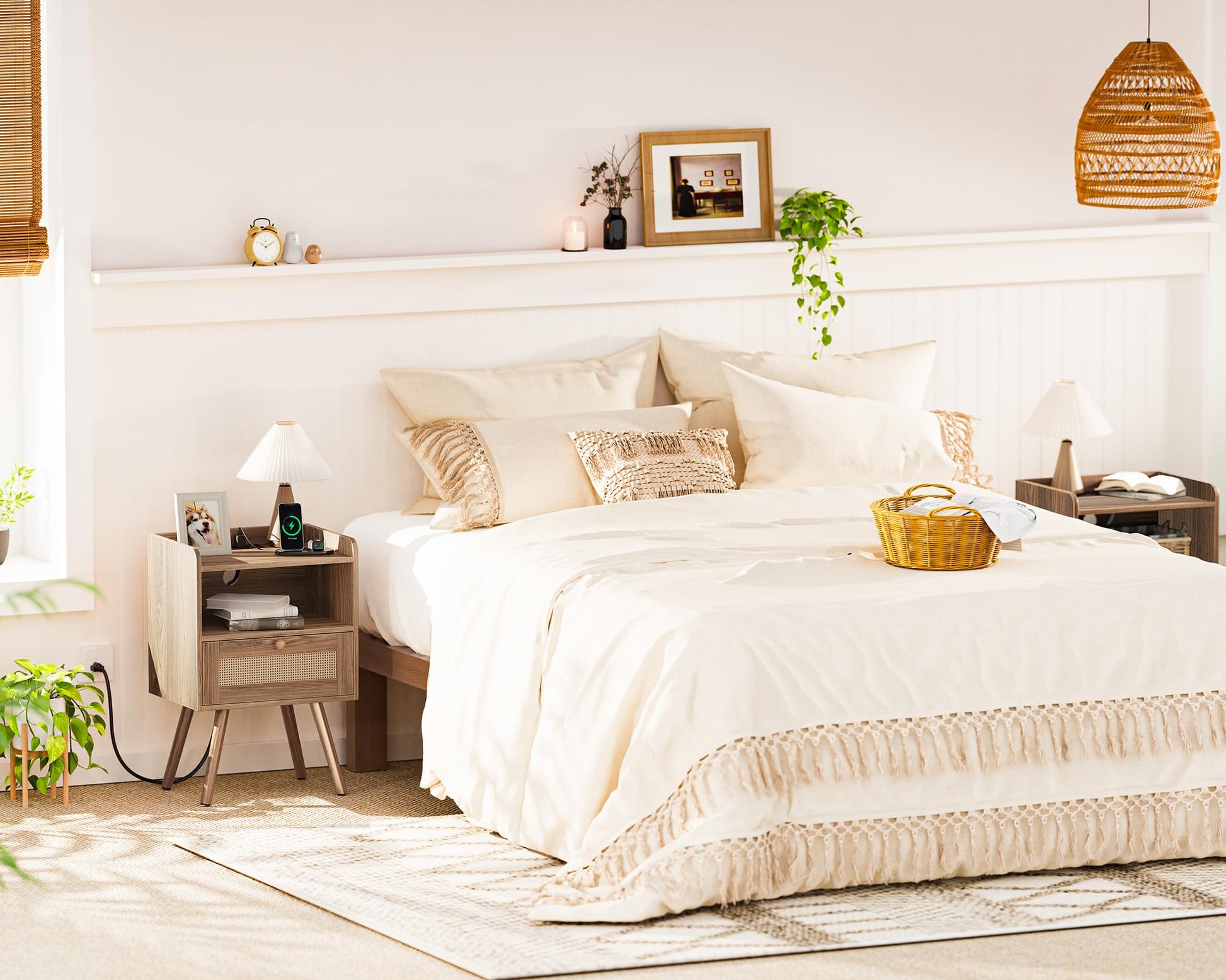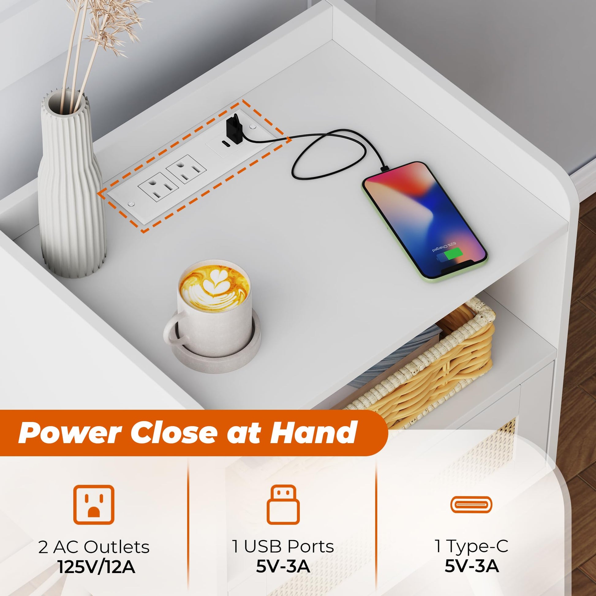- [Two Is Better]: Set of 2 rattan nightstands, a more space-coordinated home space! Plug in your lamps or phones on this narrow end table with 2 AC outlets, 1 USB port and 1 Type-c port, it will provide power close at hand