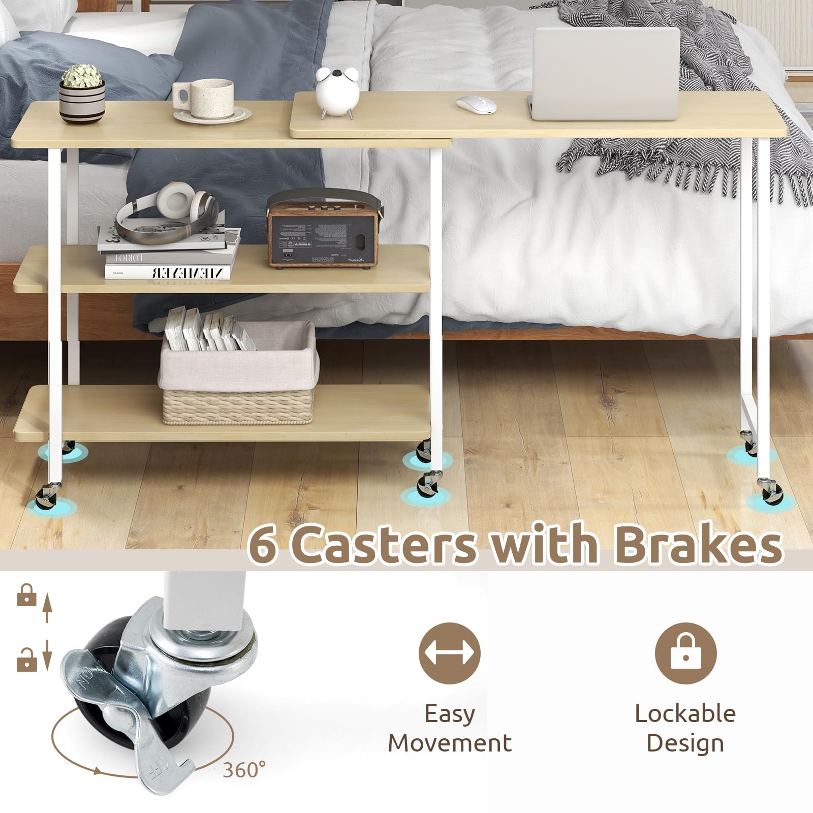 - 6 Casters with Brakes: Equipped with 6 smooth rolling casters with lockable design, the swivel laptop table can go anywhere you like! And you can easily keep it firm in place as you want, just by kicking down the brakes to set the rolling table still.
