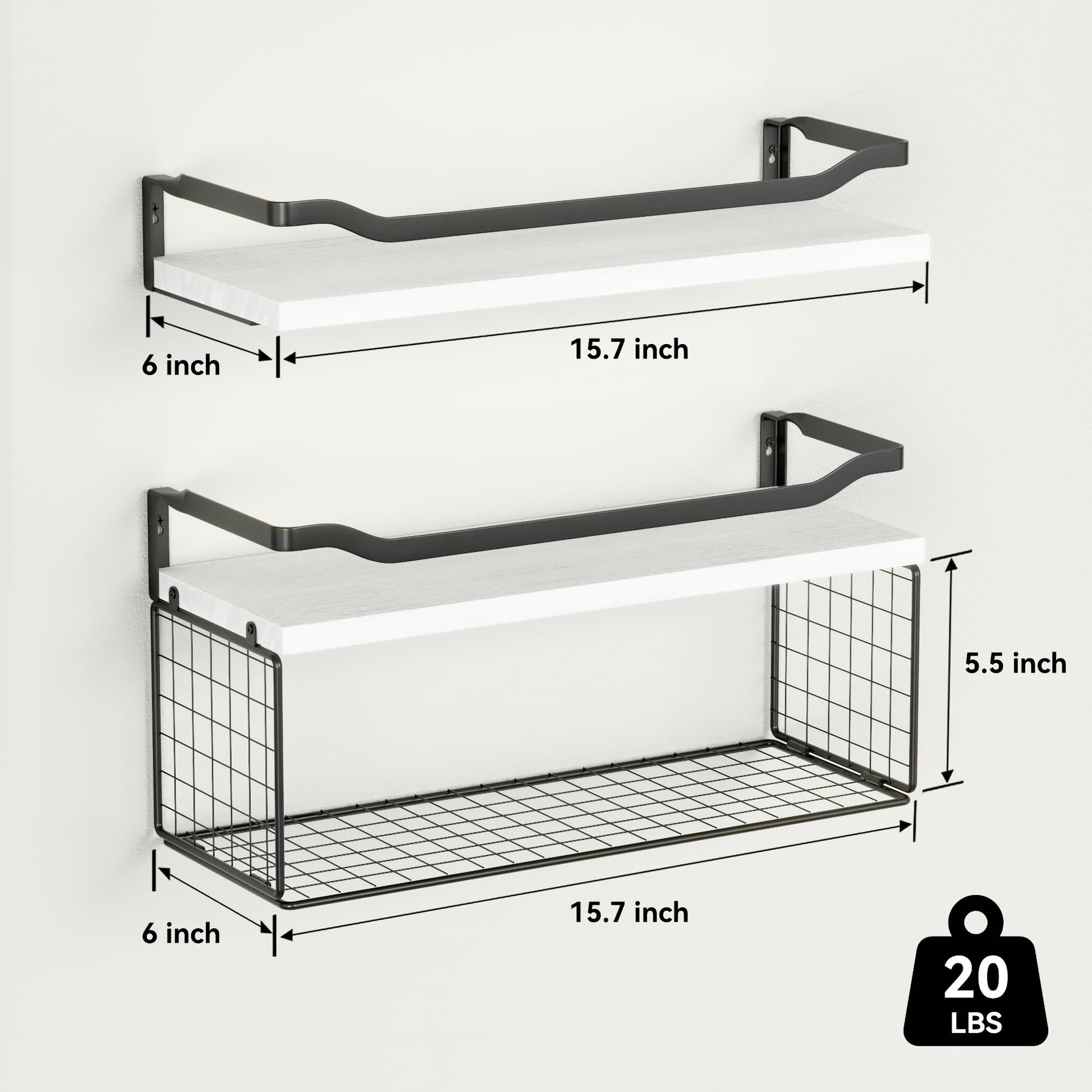 - 【Install Without Any Worries】 - The package includes: 1 clear installation guide, 2 shelf boards with metal guardrails installed, 1 wire storage basket and hardware. It only takes a few minutes to follow the instructions and complete the mounting, then you can curate your own storage for wall. Shelf dimension: 15.7 inch L x 6 inch W. If there's any problem concerning installation, please contact us via Amazon immediately, WOPITUES customer service team is always here for you.