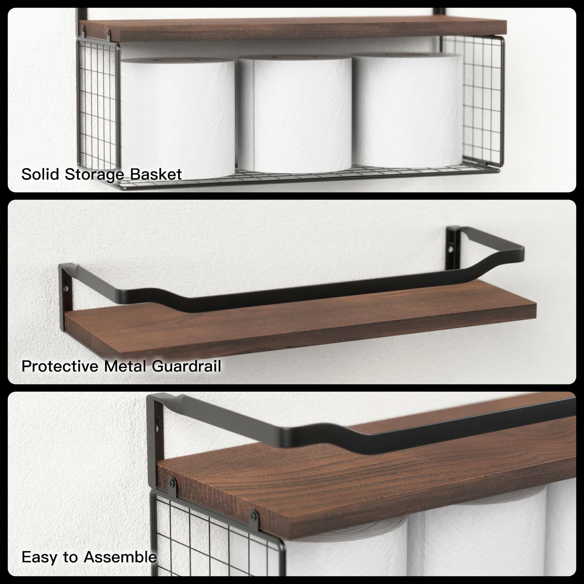 Floating Shelves with Wire Storage Basket, Bathroom Shelves Over Toilet with Protective Metal Guardrail, Wood Wall Shelves for Bathroom, Bedroom, Living Room, Toilet Paper-Black